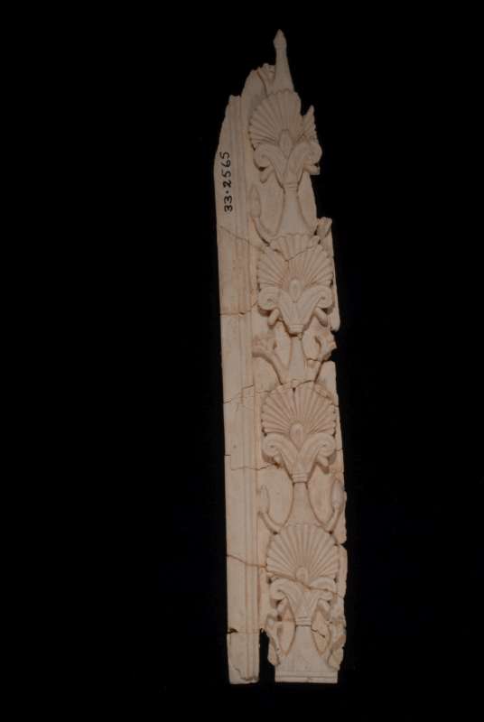 This object is an ivory furniture inlay depicting palmettes, ornamental palm leaves. It was excavated from Samaria and dates to the Iron Age II (9th–8th century BCE). It has a height of 17.6 cm and a length of 3.4 cm. (The Israel Museum, Jerusalem)©The Israel Museum, Jerusalem. Used with permission. Israel Antiquities Authority 1933-2565, Archaeology/Israelite & Persian Periods.
