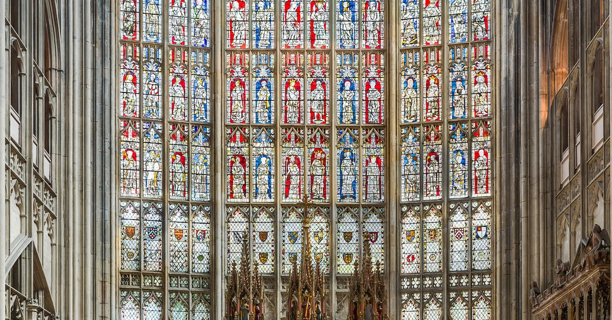 The Crécy window of Gloucester Cathedral, England. The window commemorates those nobles who fought at the Battle of Crécy in 1346 CE during the Hundred Years' War with France.