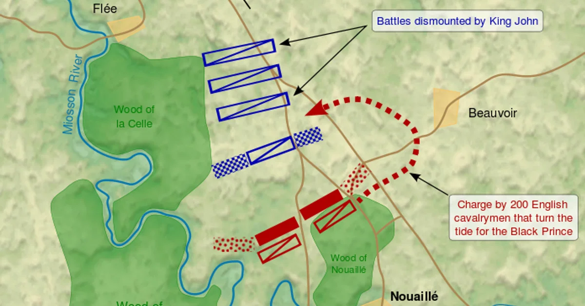 A map showing the initial battle lines at the Battle of Poitiers in France on 19 September 1356 CE between England and France. The English, led by Edward the Black Prince (1330-1376 CE), were victorious in the second major battle of the Hundred Years’ War (1337-1453 CE).
