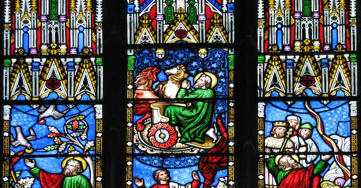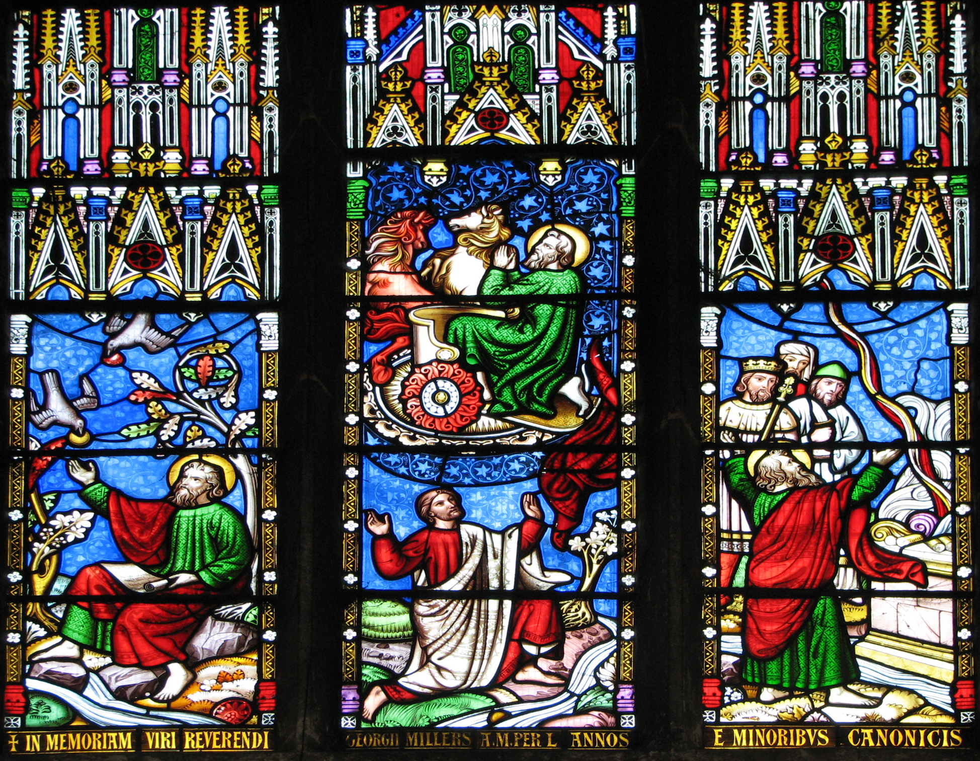 In the left light, Elijah is fed by ravens in the desert; in the right light, he defeats the prophets of Baal, and in the central light, he is taken up to heaven in a fiery chariot.Victorian glass from Ely Cathedral.