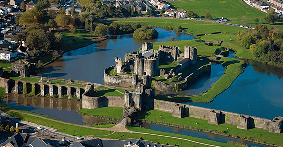 An aerial view of Caerphilly Castle in Wales, built between 1268 and 1290 CE.