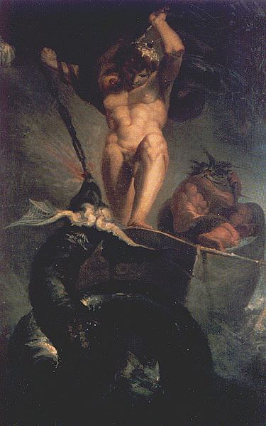 Thor fighting the mighty giant serpent Jörmungandr during a fishing trip with Hymir the giant. Painting by Henry Fuseli, 1788.