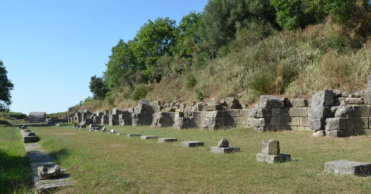 The large Stoa of Apollonia in Albania was built in the 4th century BCE. It is the best-preserved monument from the Classical period in the Agora and was used up to the 2nd century CE. It has a rectangular plan measuring 72.2m by 10.5m, divided lengthwise in two by an inner colonnade made up of 36 octagonal Doric columns.