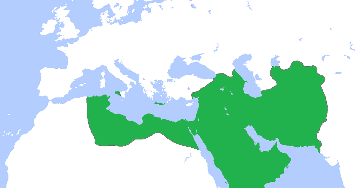 The extent of the Abbasid empire at its greatest extent has been shaded with green. The whole of the Arabian Peninsula, Persia, Iraq, Syria, parts of Asia Minor, Egypt, the North African coast excluding Morocco (Maghreb), Crete and the western half of Sicily were controlled by the Abbasid Empire at its height c. 850 CE.