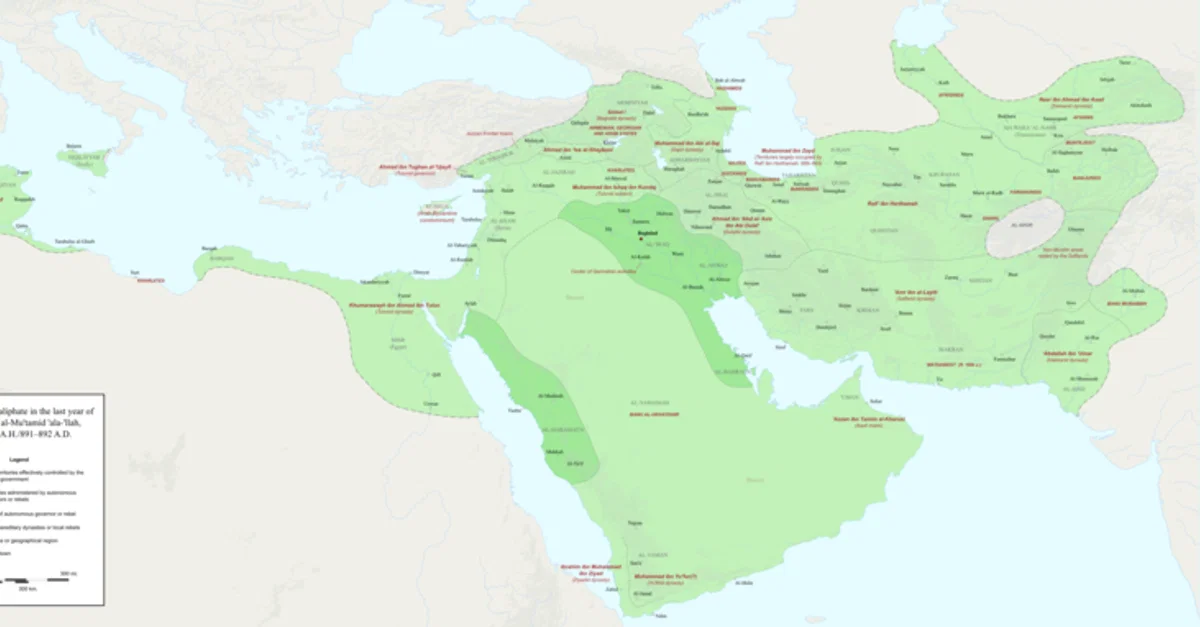 A map showing various territories that were carved up by local rulers in the late 9th Century CE, either under the suzerainty of the Abbasid Dynasty or in rebellion against the Abbasid Empire.