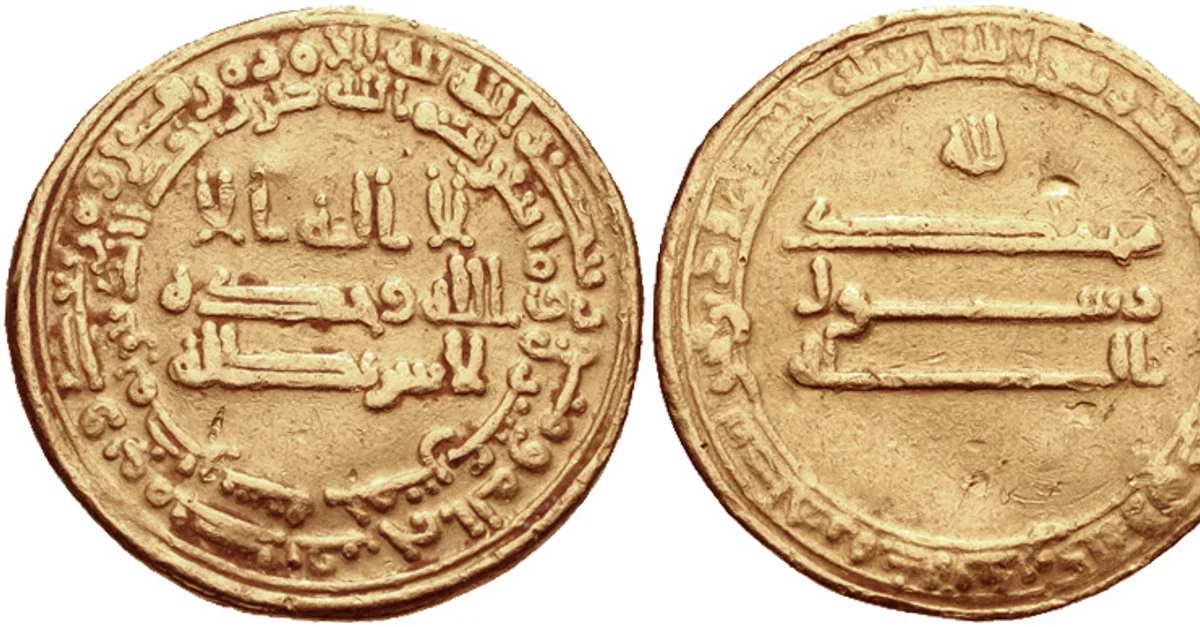 These are the dinars (gold coins) inscribed in the reign of Caliph al-Ma'mun (r. 813-833 CE). Notice that they consist of inscriptions only and not illustrations, as was the case with Rashidun and early Umayyad coins, the Umayyad Caliph Abd al-Malik standardized coins, this pattern was taken up by the Abbasids as well.