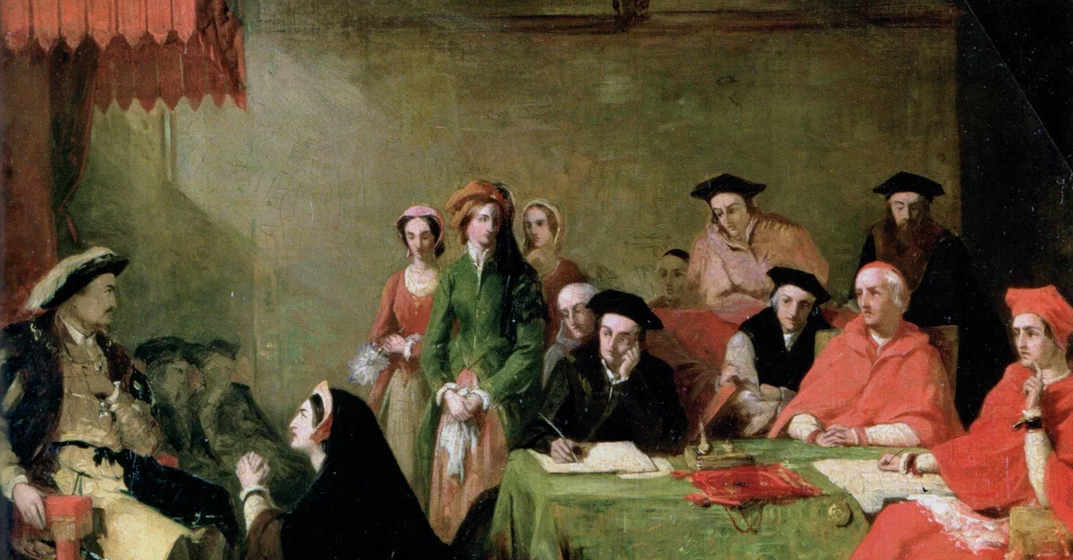 A 19th century CE painting by Henry Nelson O'Neil showing the court of 1529 CE which convened to annul the marriage of Catherine of Aragon (1485-1536 CE) and Henry VIII of England (r. 1509-1547 CE). The marriage would not be annulled until 1533 CE.