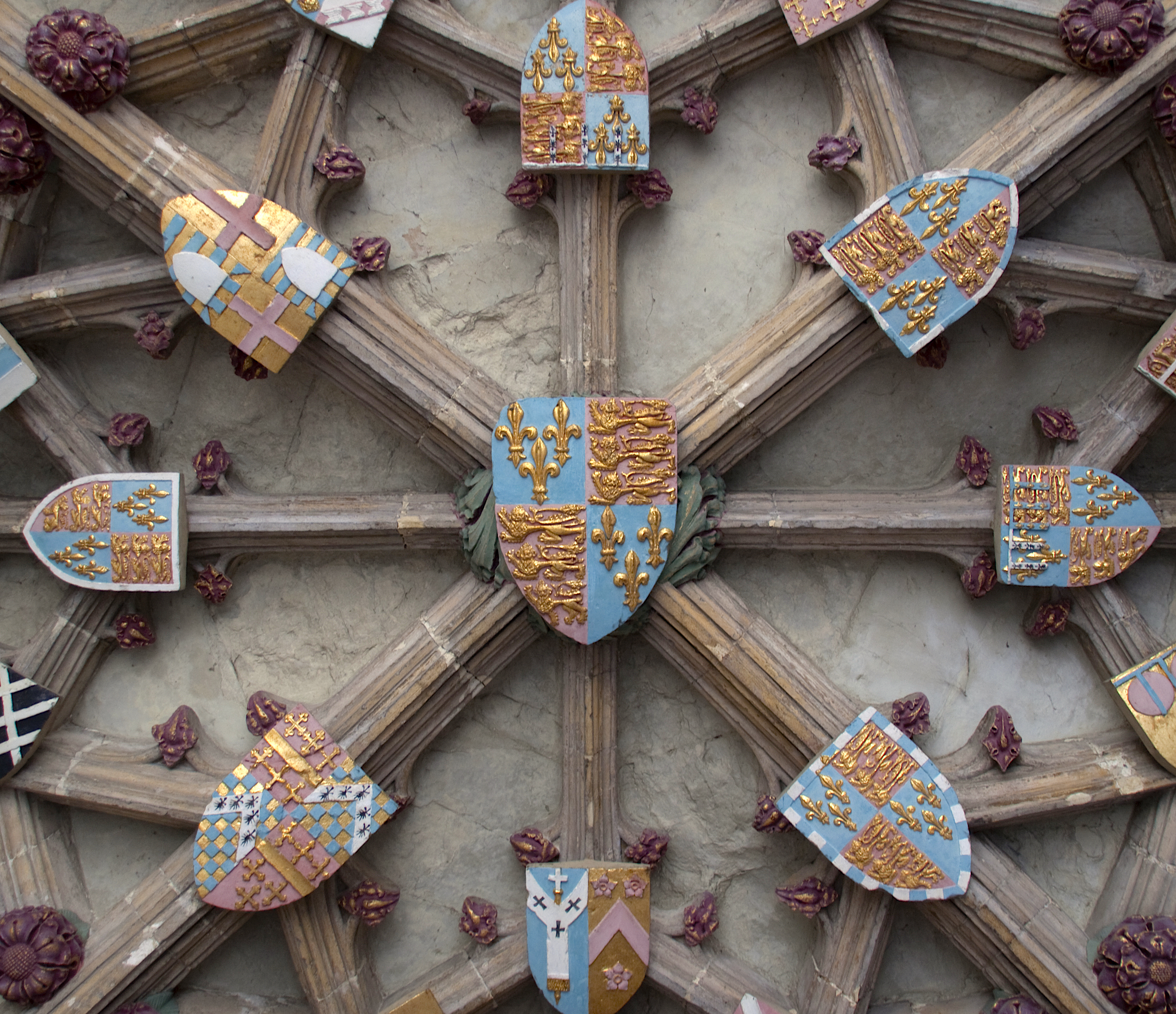 A view of the entrance ceiling of the South Porch at Canterbury Cathedral showing the coats of arms of Henry V of England (r. 1413-1422 CE) in the centre along with those of various other nobles.