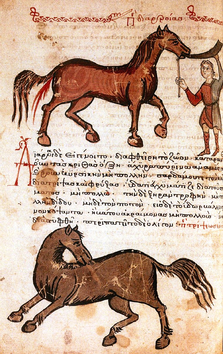 Instructions on drenching a horse to induce diarrhea from the Byzantine manuscript Hippiatrica. (Hippiatrica, Parisinus greacus 2244, fo. 74v) 14th century CE