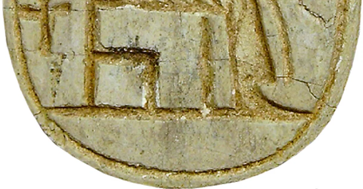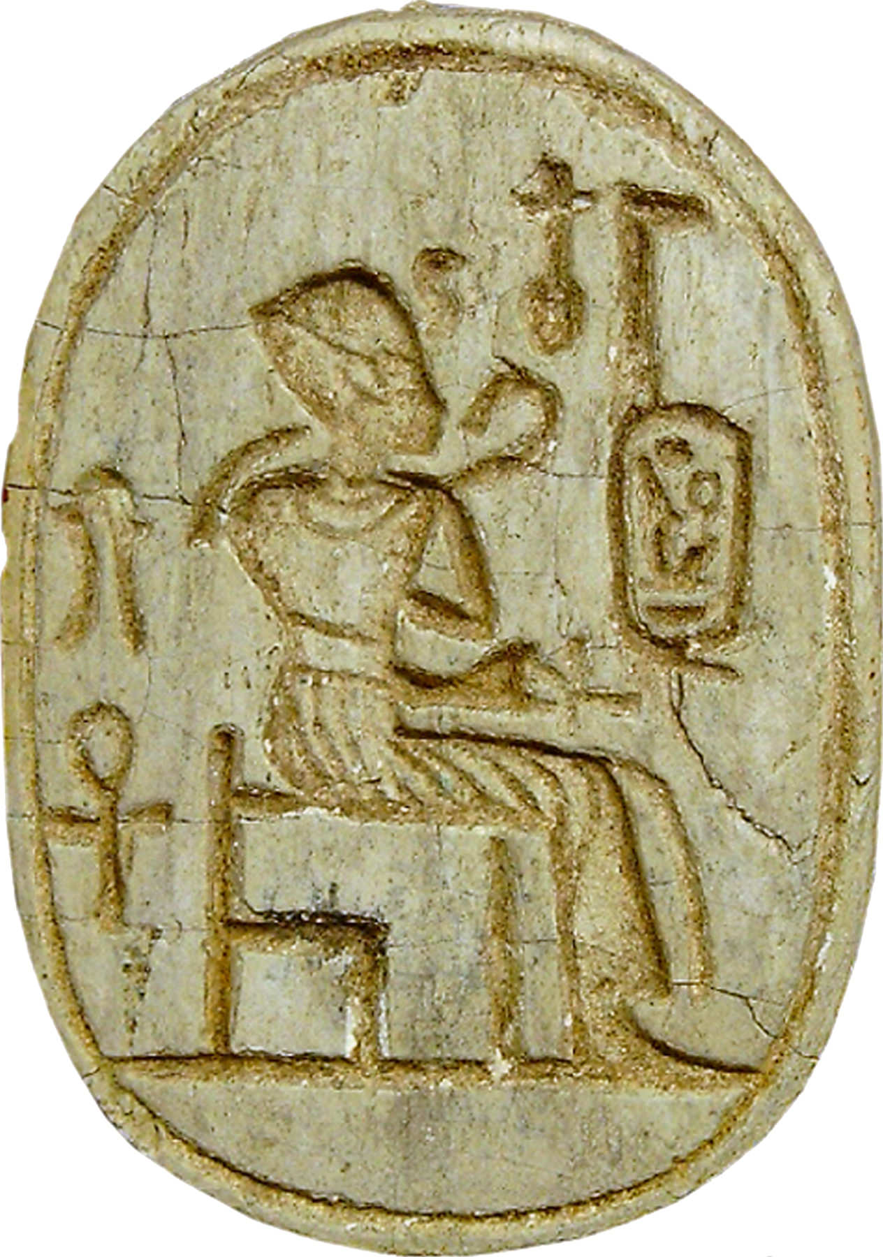 Scarab shaped amulet containing the image and cartouche of Amenhotep III, promising its owner in this world 'life' (represented by an ankh). These beetle amulets were used in Ancient Egypt for rituals or administrative purposes (14th century BCE).