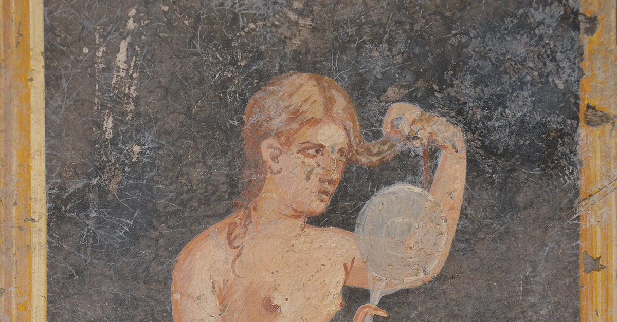 A fresco showing a woman looking in a mirror as she dresses (or undresses) her hair. From the Villa of Arianna at Stabiae (Castellammare di Stabia). 1st century CE. Naples National Archaeological Museum.