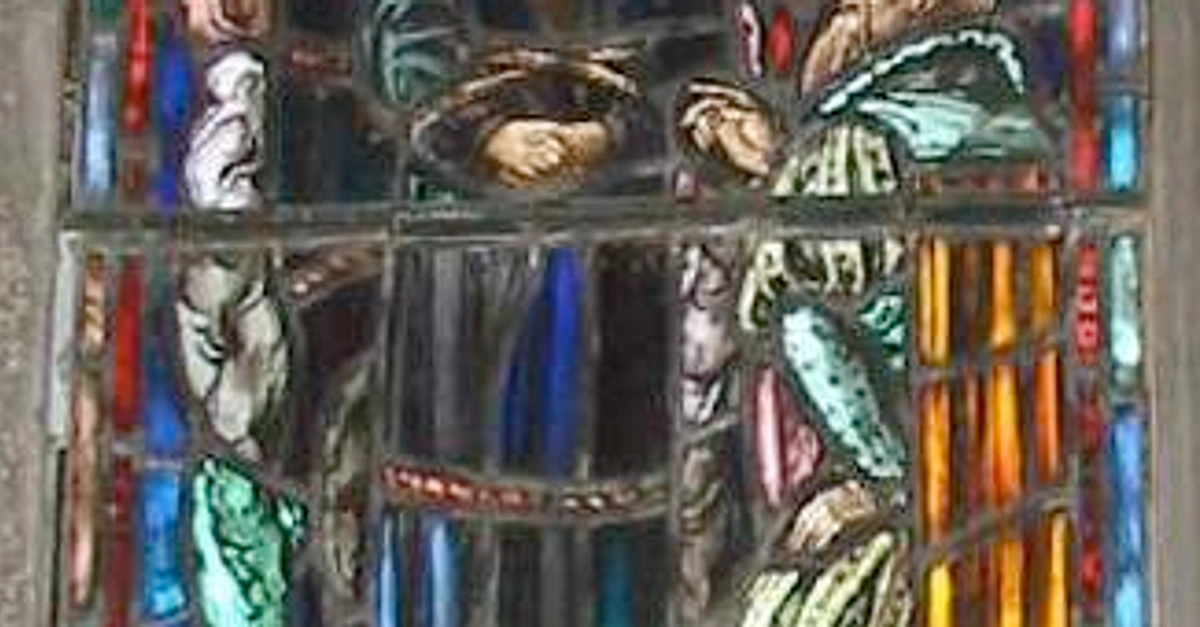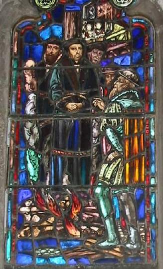 A detail of a modern stained glass window showing the death of Thomas Cranmer, Archbishop of Canterbury (1533-155 CE) and one of the primary architects of the English Reformation. (Christ Church, Little Rock, Arkansas, USA).