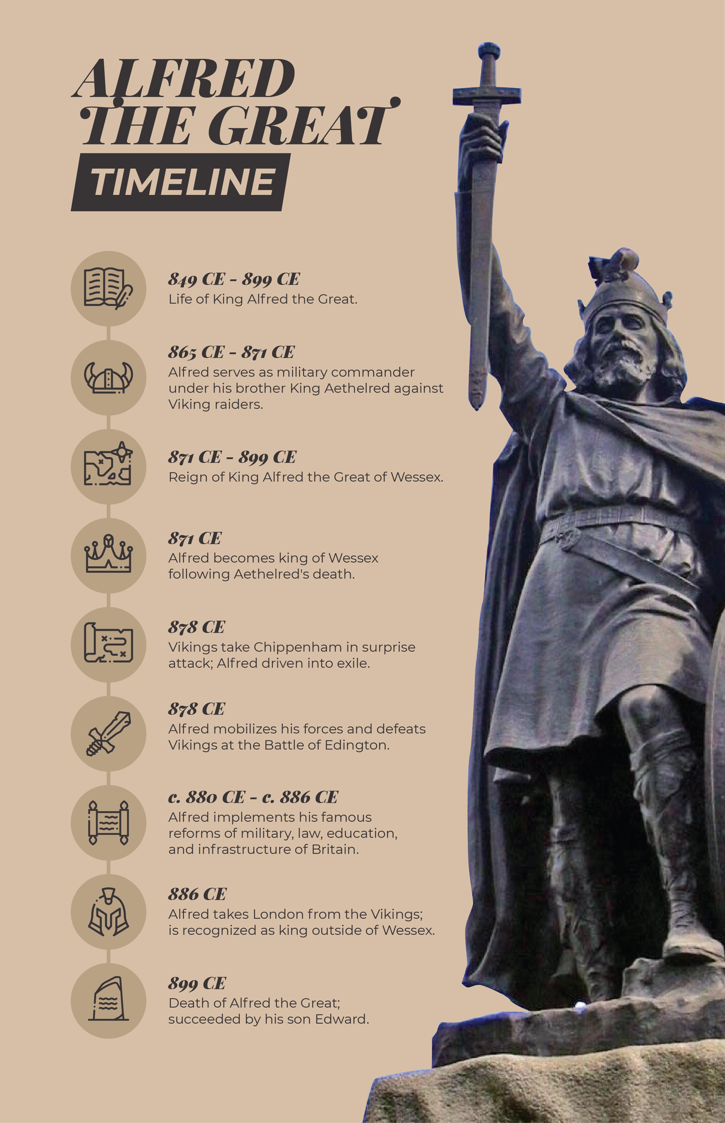 A timeline of events in the life of Alfred the Great (r. 871-899 CE), king of Wessex in Britain. (Alfred statue at Winchester by Odejea)