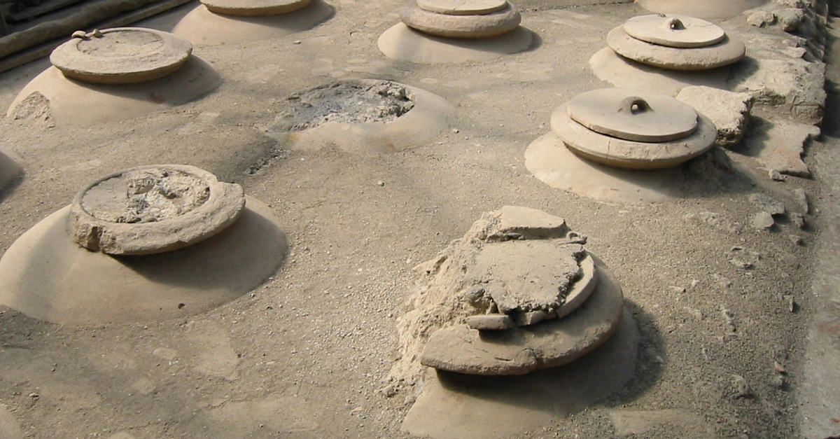Dolia (large terracotta jars) for storing wine in the ancient Roman Villa Rustica in Boscoreale (Italy). Photo taken in 2002 CE.