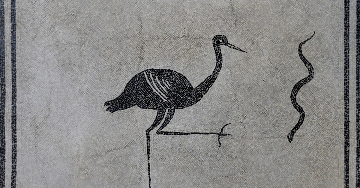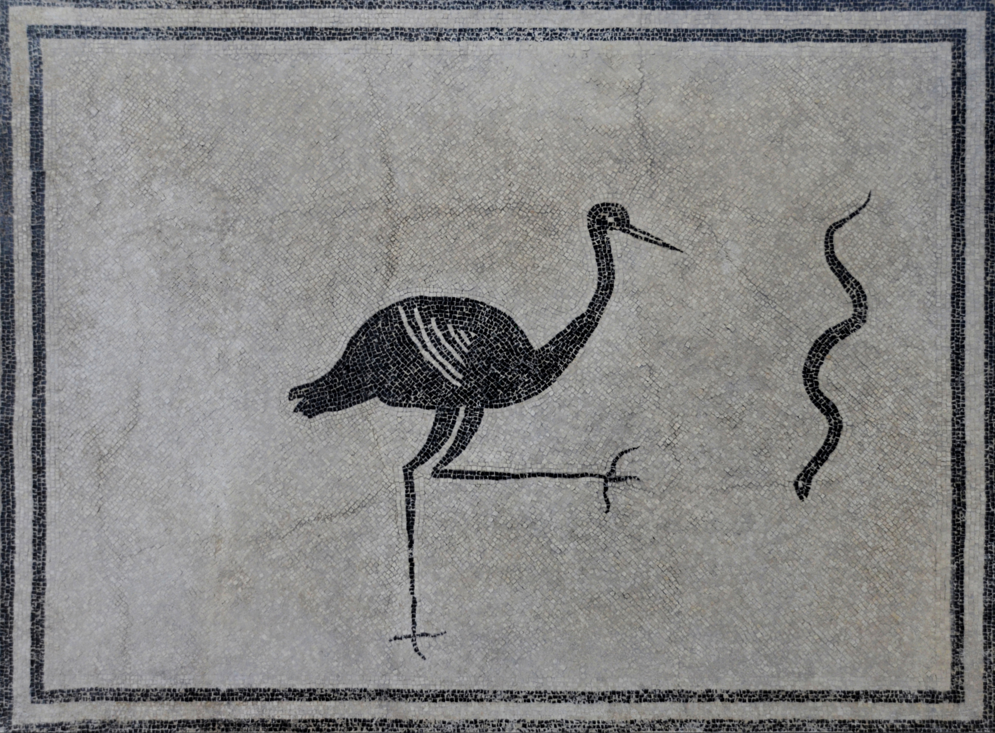 Black and white mosaic floor depicting a stork advancing towards a snake. From the caldarium (hot room of a Roman bath) of Villa della Pisanella at Boscoreale, third quarter of 1st century CE. Now in the Antiquarium of Boscoreale, Italy.