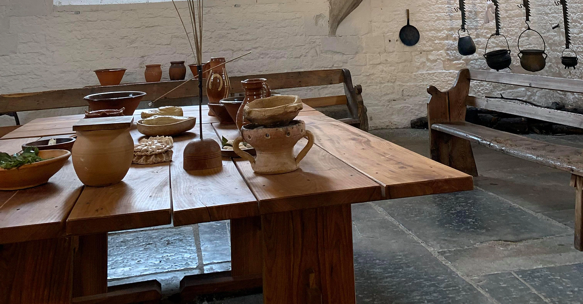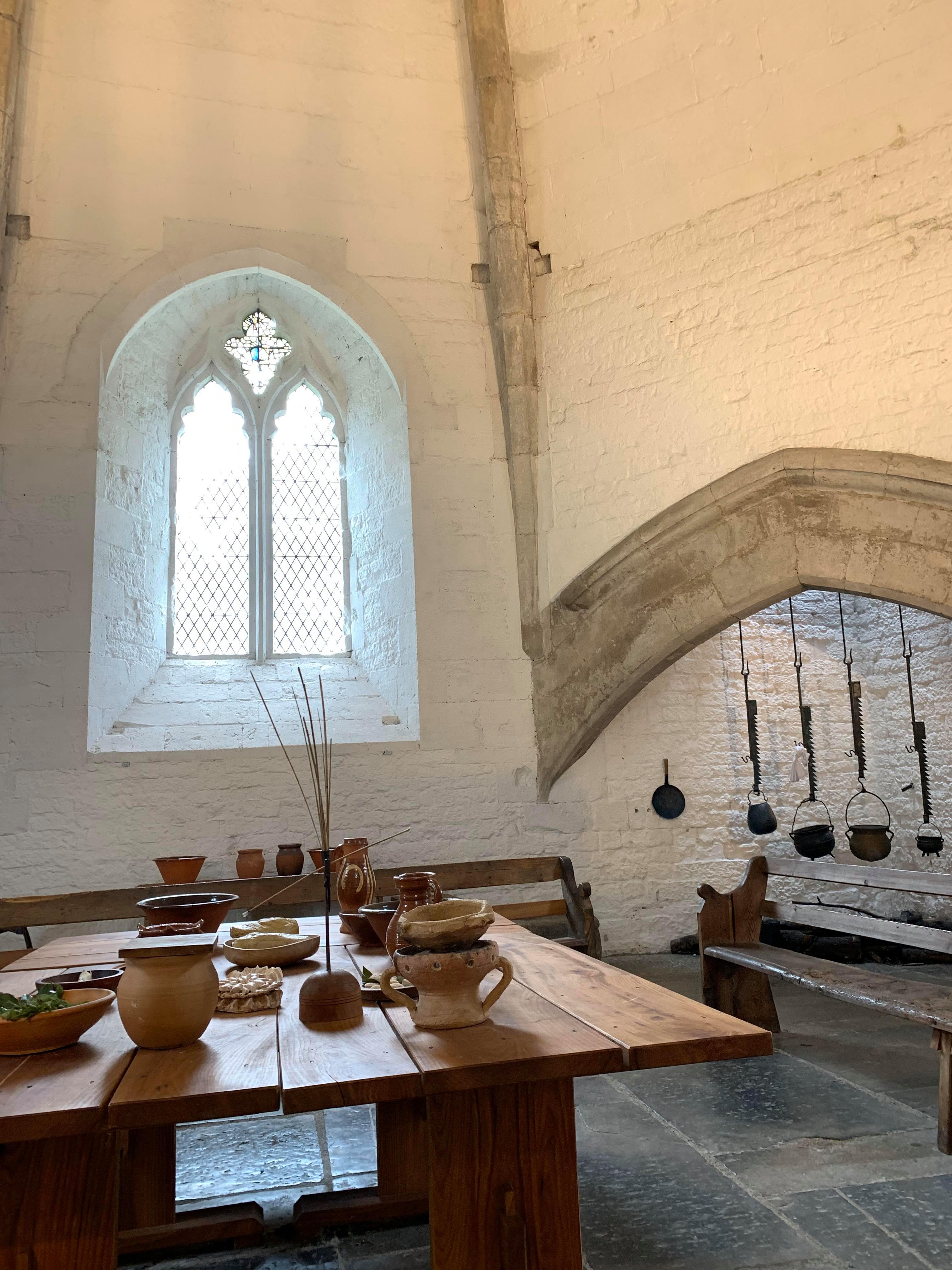 The Abbot's Kitchen at Glastonbury Abbey is known for its four large fireplaces. The building dates from the 14th century CE and is also known as "one of the best-preserved medieval kitchens in Europe".