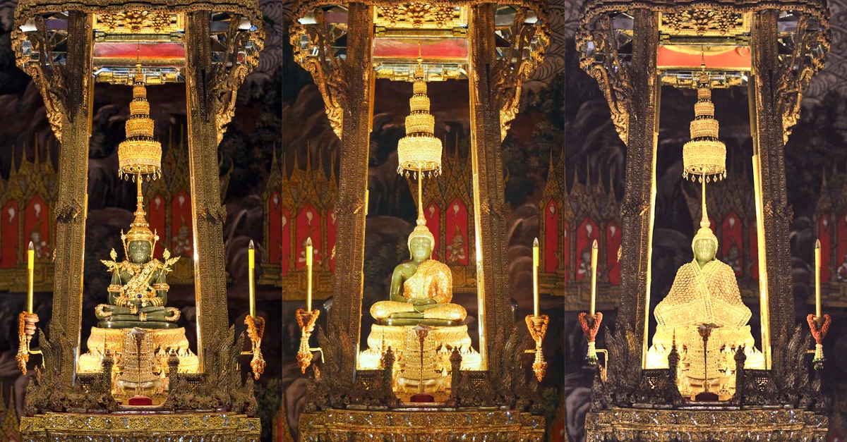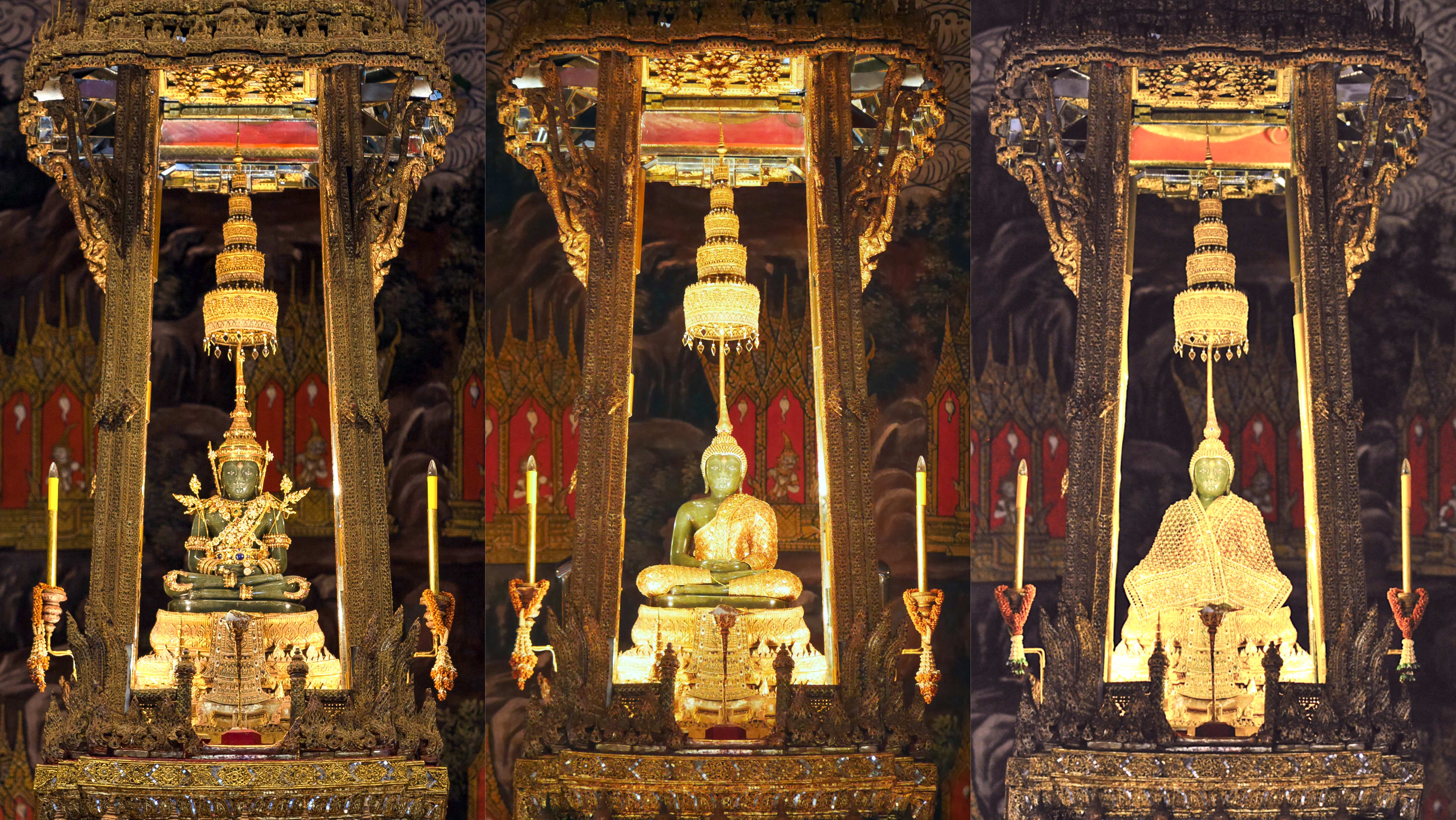 The Emerald Buddha adorned with three seasons' regalia. From left to right: Summer, Rainy, Winter. Image compiled 2020.