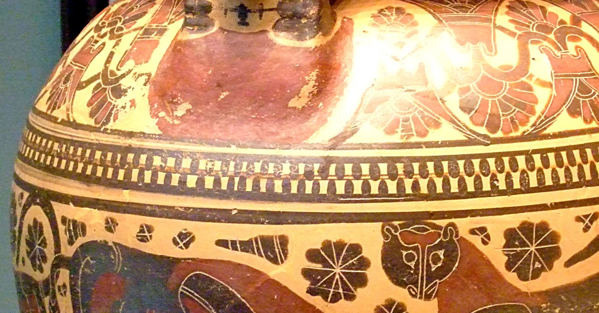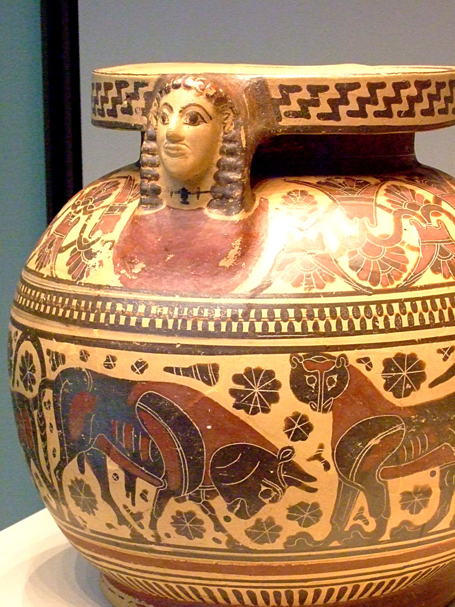A Corinthian vessel depicting animals and carrying a protome of a female head on the handle, c. 570 BCE. (Getty Villa, Malibu).