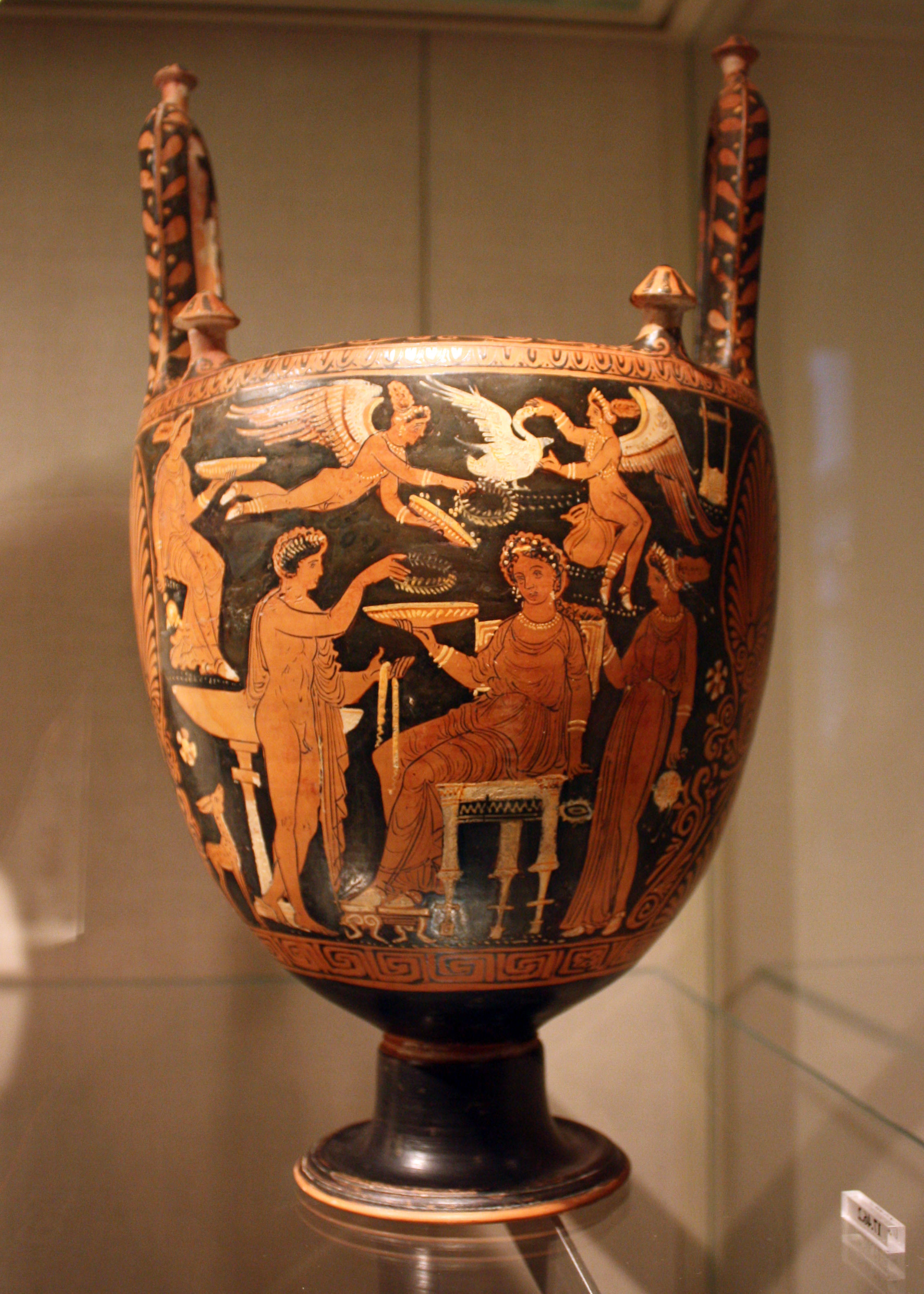 A southern Italian lebes gamikos vessel, c. 340-320 BCE. Lebetes gamikoi are distinguished by their high handles and they were associated with wedding and funeral rituals. On this example a lady perhaps prepares for a wedding or festival as erotes fly overhead. (Metropolitan Museum of Art, New York).
