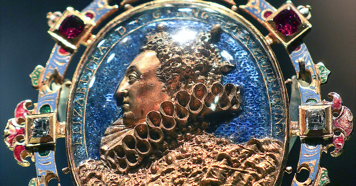 The Armada Jewel by Nicholas Hilliard (1547-1619). This combined brooch and locket shows different layers of portraits of Elizabeth I of England (r. 1588-1603).