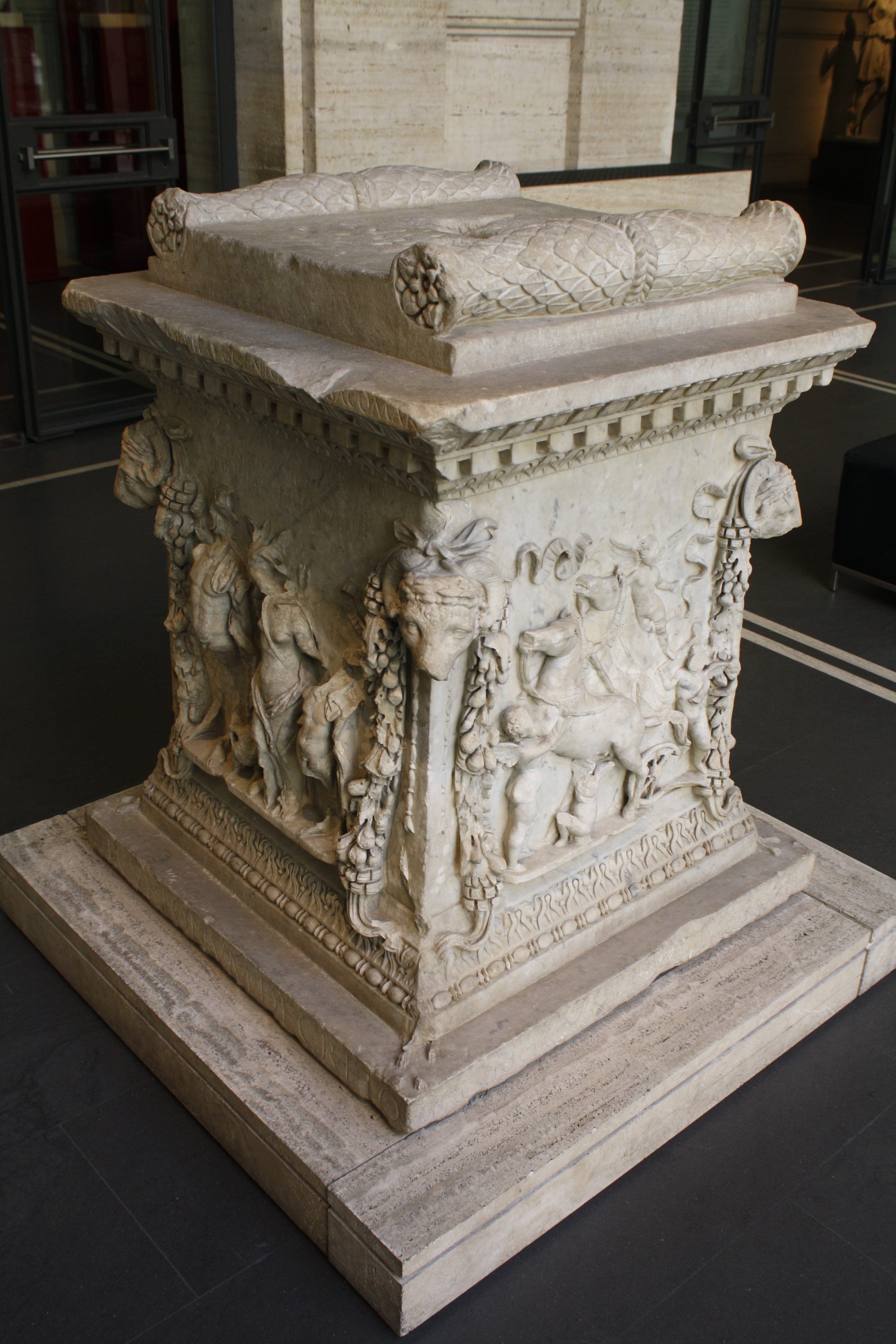 A marble sacrificial altar dedicated to the Roman gods Mars and Venus, c. 124 CE. Later used as a pedestal for a statue of the god Silvanus. The carvings tell of the founding of Rome with the figures of Romulus and Remus, their adoptive shepherd father Faustulus and a personification of the river Tiber. (Palazzo Massimo, Rome)