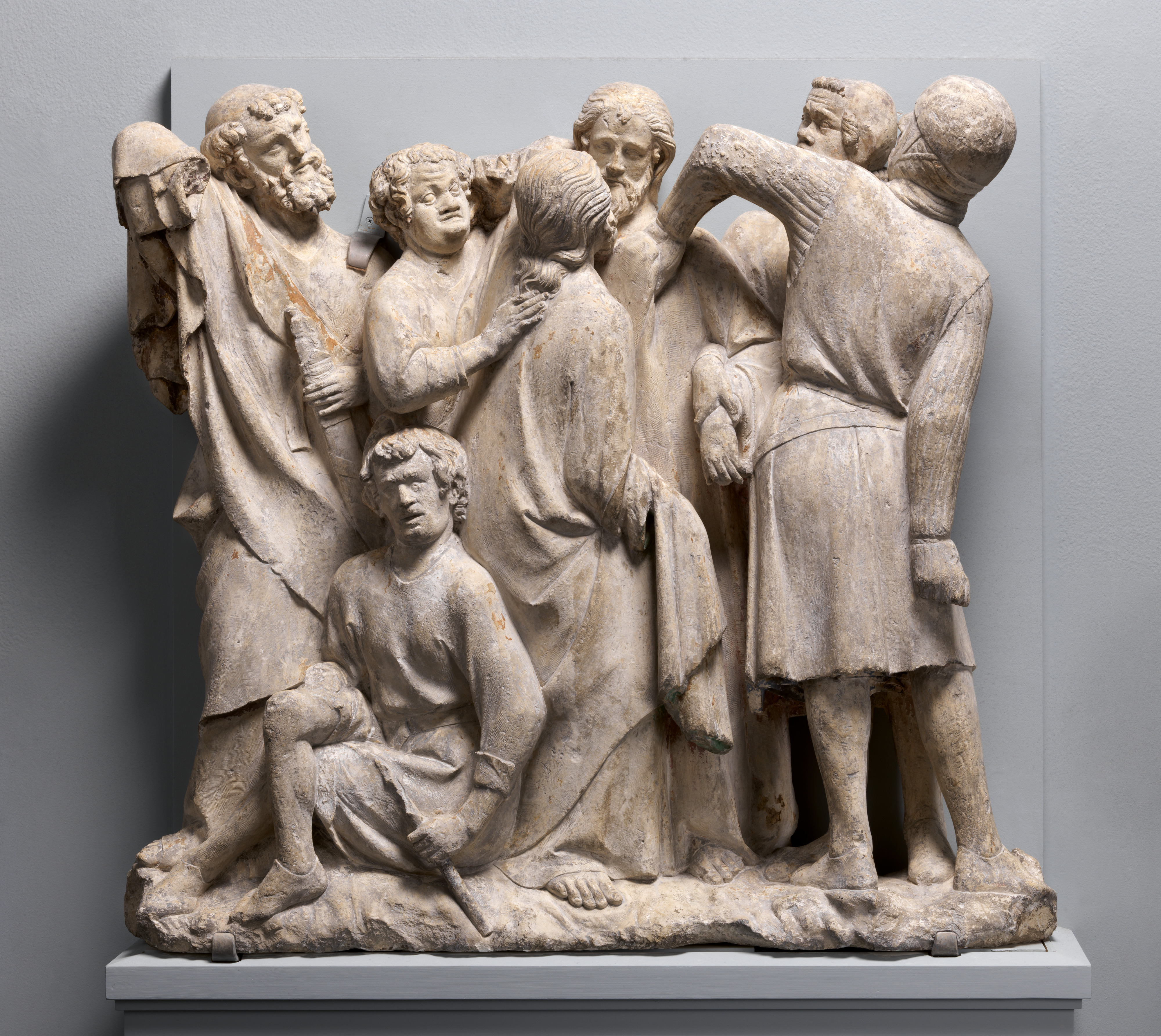 Four key events in the final hours of Jesus’ life are dramatically shown here (from left to right): Peter sheathing his sword after severing the ear of Malchus (seated), the high priest’s servant; Jesus miraculously restoring the ear; Judas betraying Jesus with a kiss; and Roman soldiers arresting Jesus. The compression of these events into one scene with its complex interweaving of figural masses creates a powerful sculptural statement. Made in Amiens, Picardy, France, 1264-88 CE Mr. and Mrs. Isaac D. Fletcher Collection, Bequest of Isaac D. Fletcher, 1917 CE