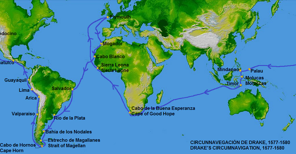 Continentalis. (2020, June 24). Map of Francis Drake's Circumnavigation, 1577-80 CE. World History Encyclopedia. https://www.worldhistory.org/image/12411/map-of-francis-drakes-circumnavigation-1577-80-ce/