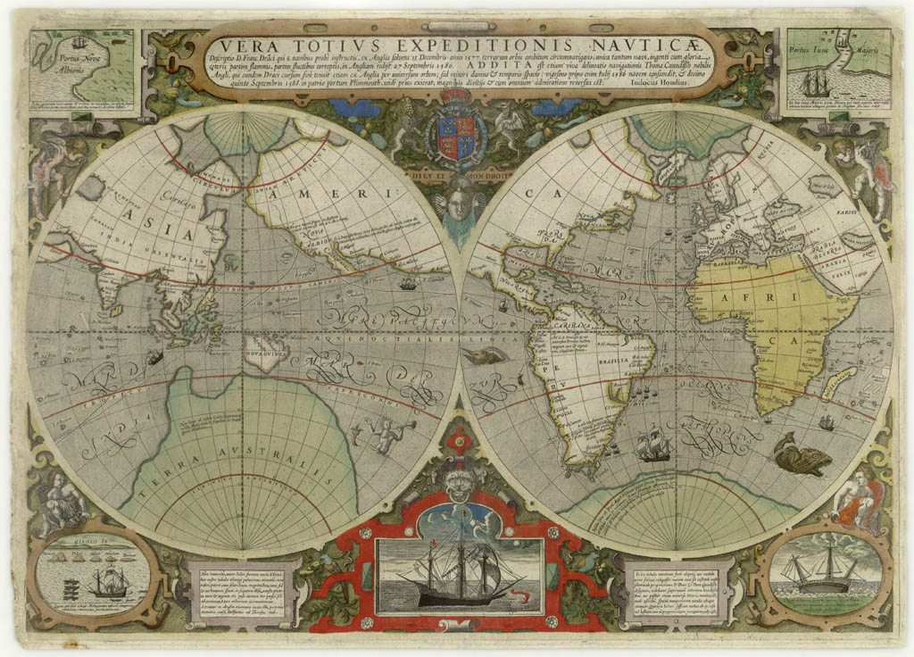 A c. 1595 CE map by Jodocus Hondius showing the circumnavigations of the globe by Francis Drake (1577-80 CE) and Thomas Cavendish (1586-88 CE). (Library of Congress)