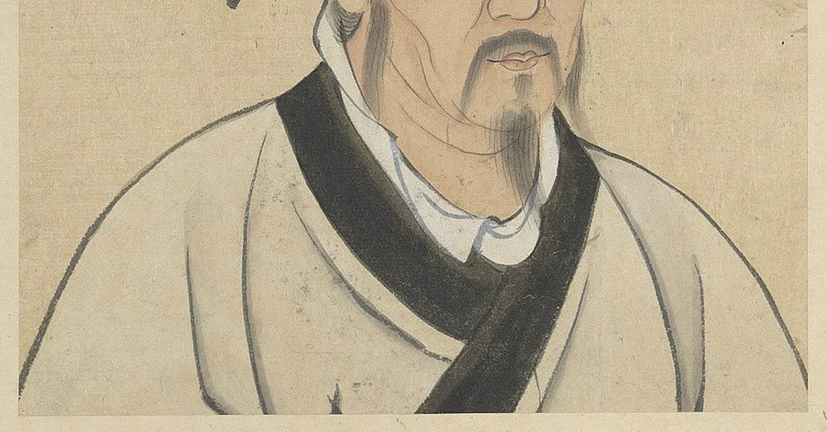 Mencius in the album Half Portraits of the Great Sage and Virtuous Men of Old. The full album consists of sixty leaves. It includes 120 notable Confucians, spanning from the Spring and Autumn period (c. 772-476 BCE) up to the Yuan Dynasty. Judging from the names in the title labels in the upper right corners of the portraits, the album must have been done after the Yuan Dynasty court ennobled Confucius' major disciples in 1330 CE. National Palace Museum, Taipei.