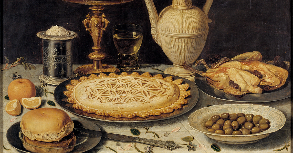 A still-life painting by Clara Peeters showing typical dishes of 16-17th century CE northern Europe. In the centre is a pie with a container behind it for salt and a typical low, round bread loaf in the foreground. The olives and orange would have been luxury items in northern Europe at that time. Painted c. 1611 CE. (Museo del Prado, Madrid)