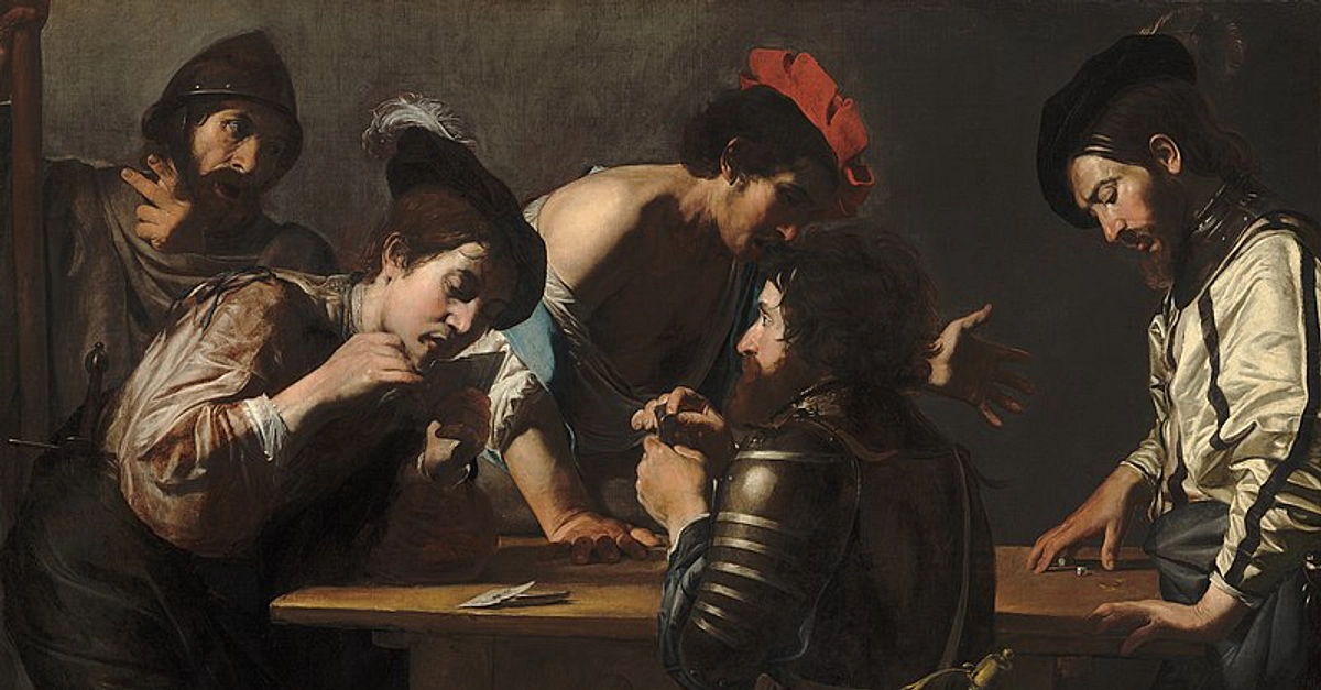 An early 17th century CE painting showing soldiers playing cards by Valentin de Boulogne (1591-1632 CE). (National Gallery of Art, Washington, D.C.)