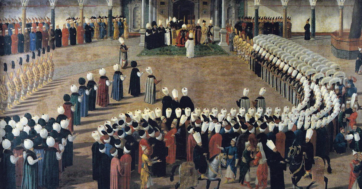 Sultan Selim III (r. 1789–1807 CE) holding an audience in front of the Gate of Felicity. Courtiers are assembled in a strict protocol. Oil on canvas. (Topkapı Palace Museum, Istanbul; Inv. 17/163)