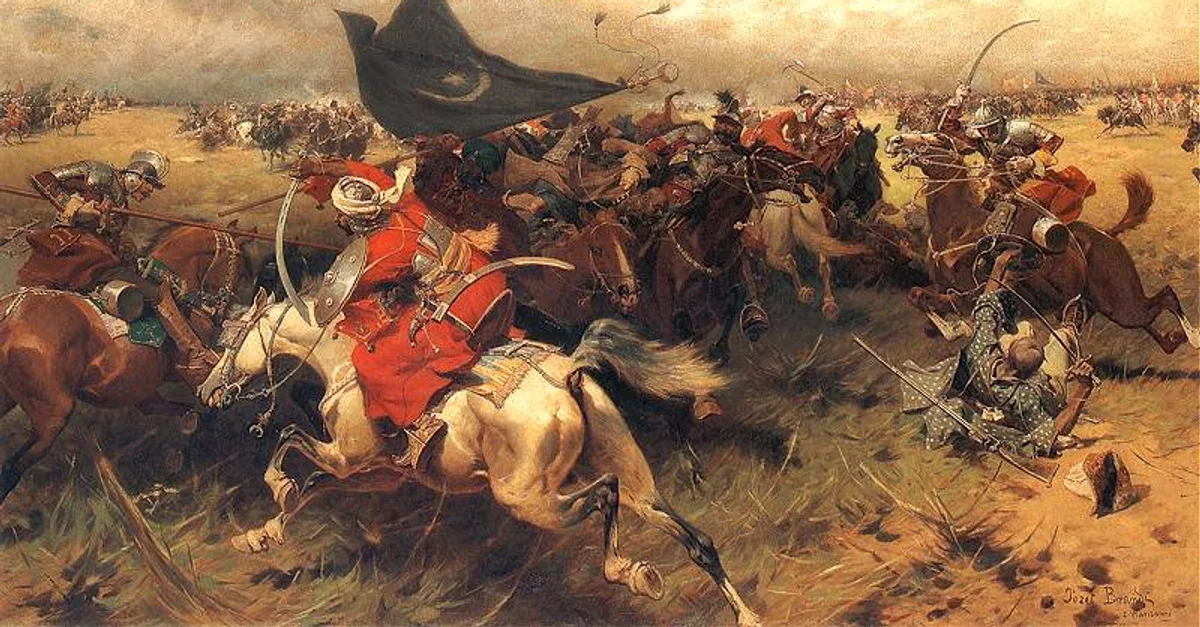 16-17 century CE Ottoman sipahis in battle at Vienna, holding the crescent banner (by Józef Brandt)