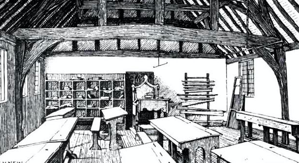 An illustration of a 19th century CE English Grammar school classroom. The classrooom had changed little since Tudor times.