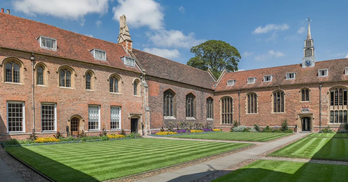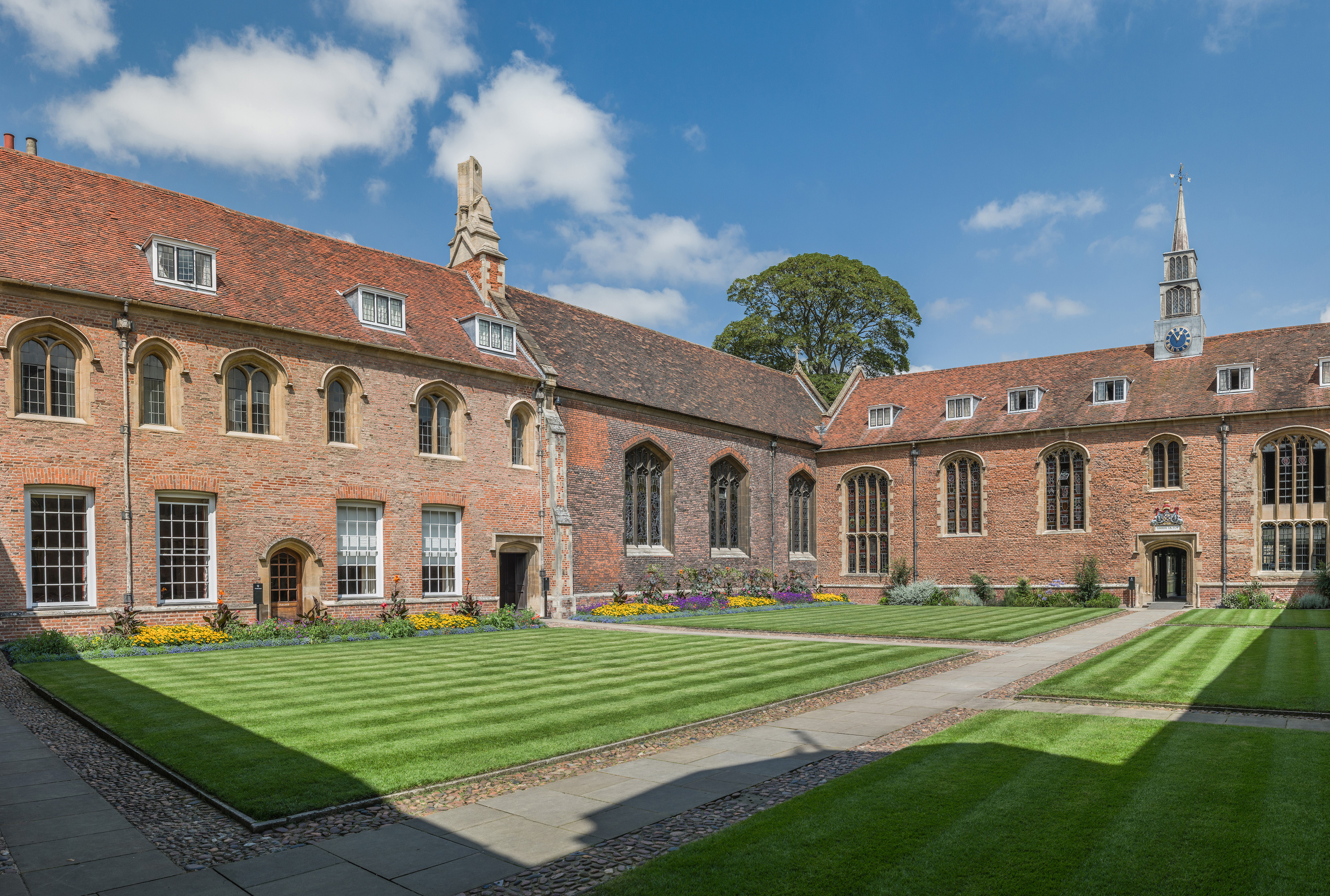The First Court of Magdalene College, part of the University of Cambridge. The college was founded in 1542 CE. The court and chapel were first laid out in the 16th century CE and then added to and altered over subsequent centuries.