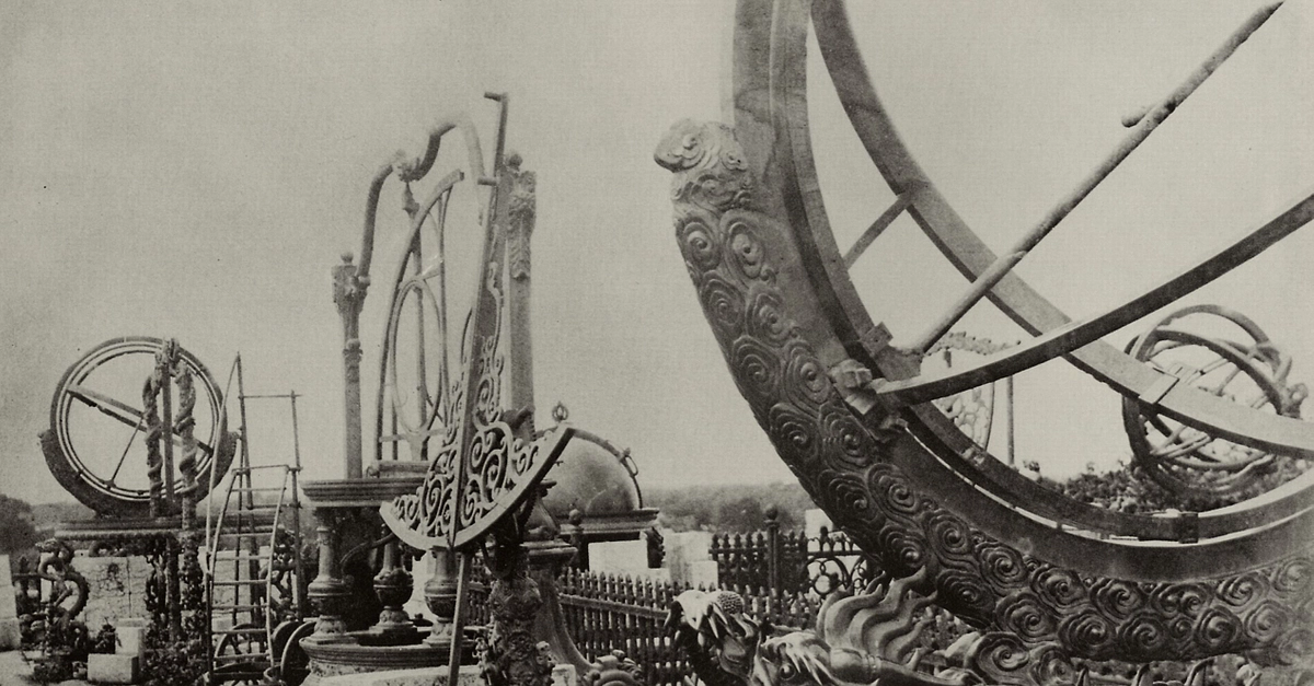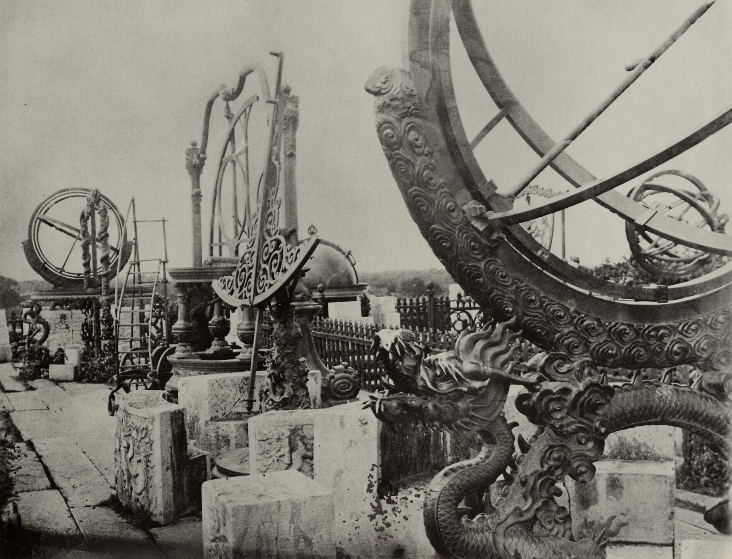 A c. 1877 CE photograph of the remains of instruments at Beijing's Observatory. Astronomy evolved in 16th-17th century CE China as a result of the introduction of scientific ideas by Jesuit missionaries such as Ferdinand Verbiest (1623-88 CE),