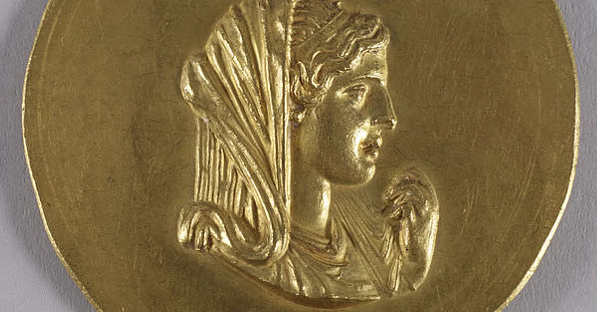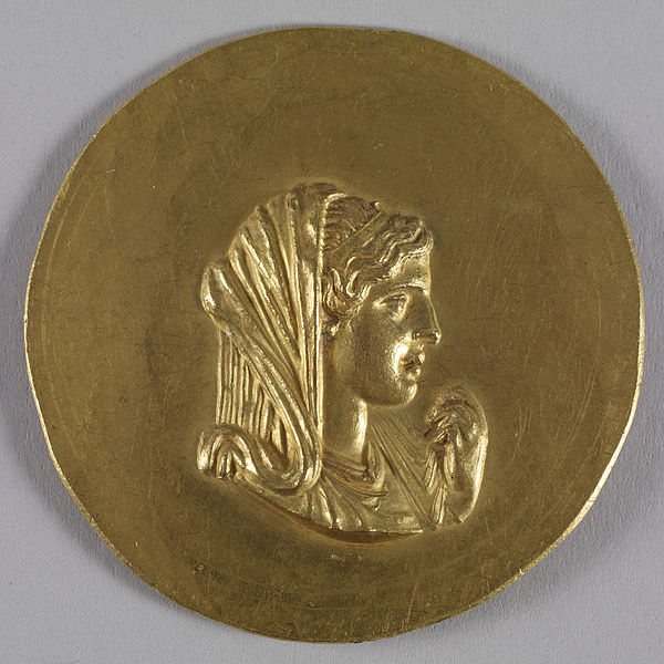 A Roman gold medallion depicting Olympias, mother of Alexander the Great. Early 3rd century CE. (Walters Art Museum).