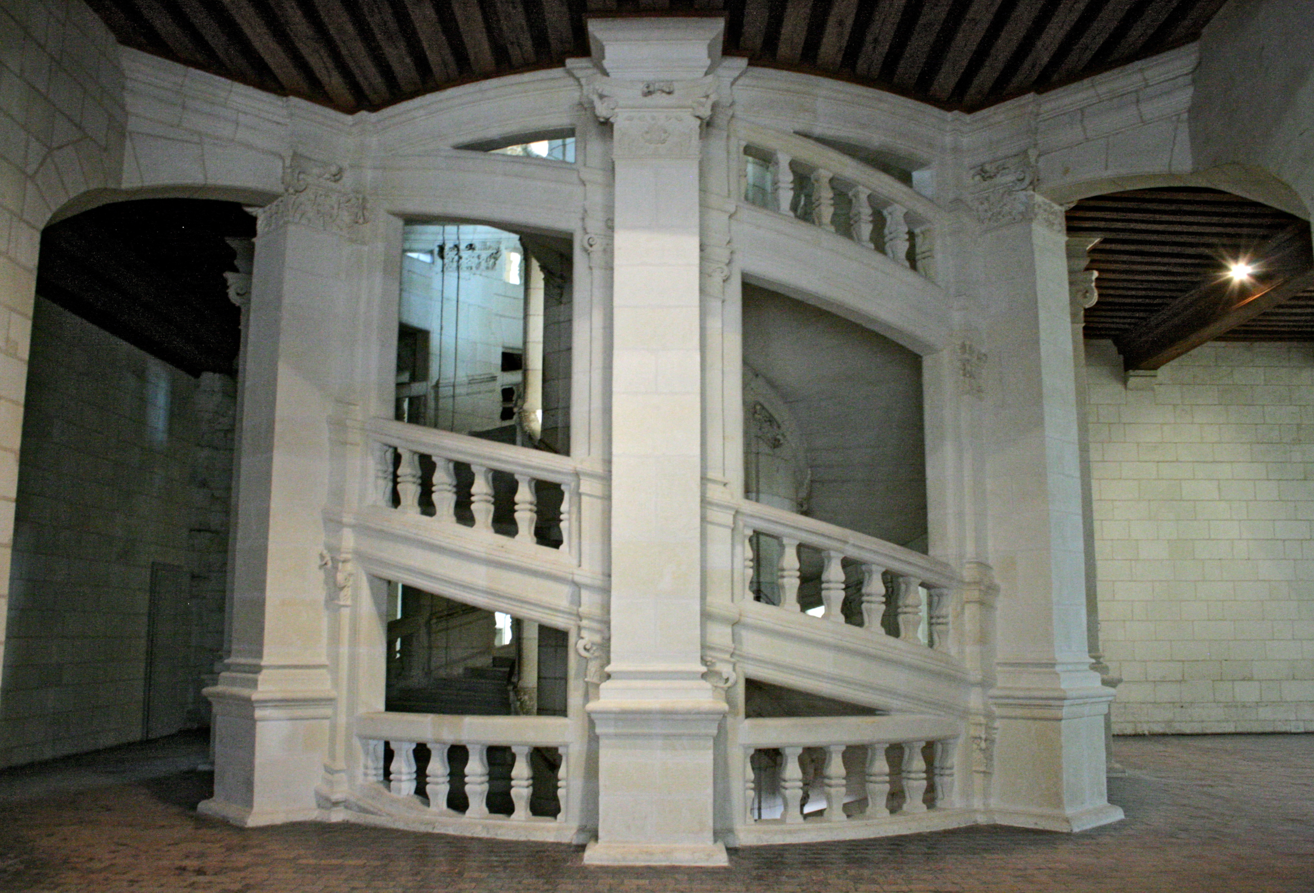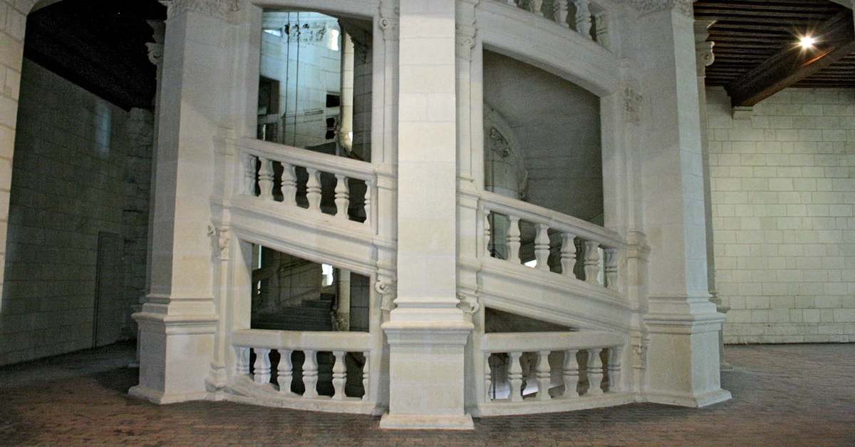 The celebrated double spiral staircase inside the Chateau de Chambord, Loir-et-Cher, France. The chateau was built between 1519 and 1547 CE.