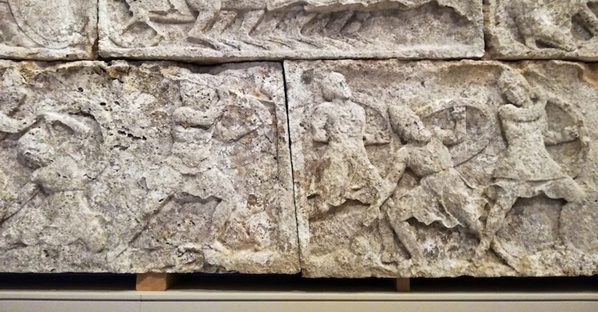Detail of a seashore battle scene from the west wall of the Heroon of Trysa in the Ephesos Museum, Vienna. The Heroon of Trysa is an ancient Lycian tomb dating to 380 BCE. Trysa is a site in southwest Turkey.