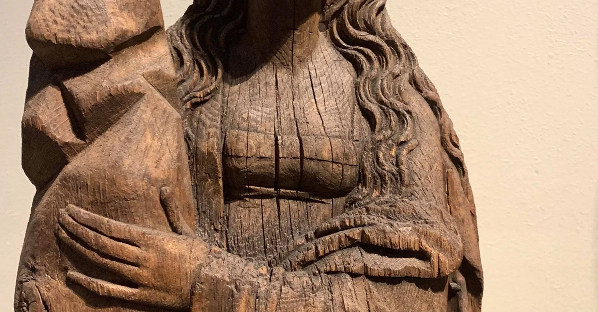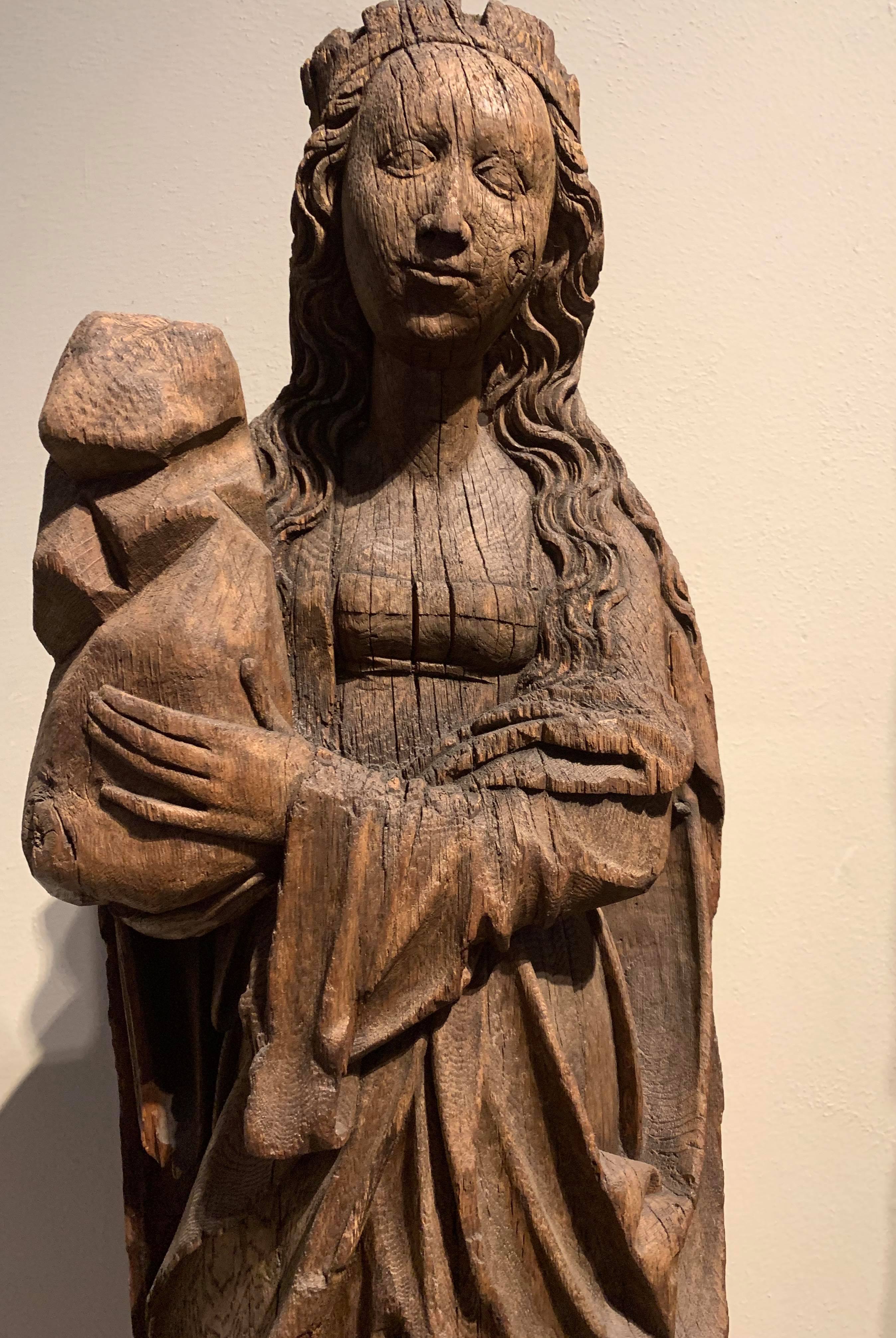 Carved wooden statue of Saint Sunniva holding a stone from Karlsøy church, Troms, Norway, c. 1520 CE. Now at the Museum of Cultural History in Oslo.