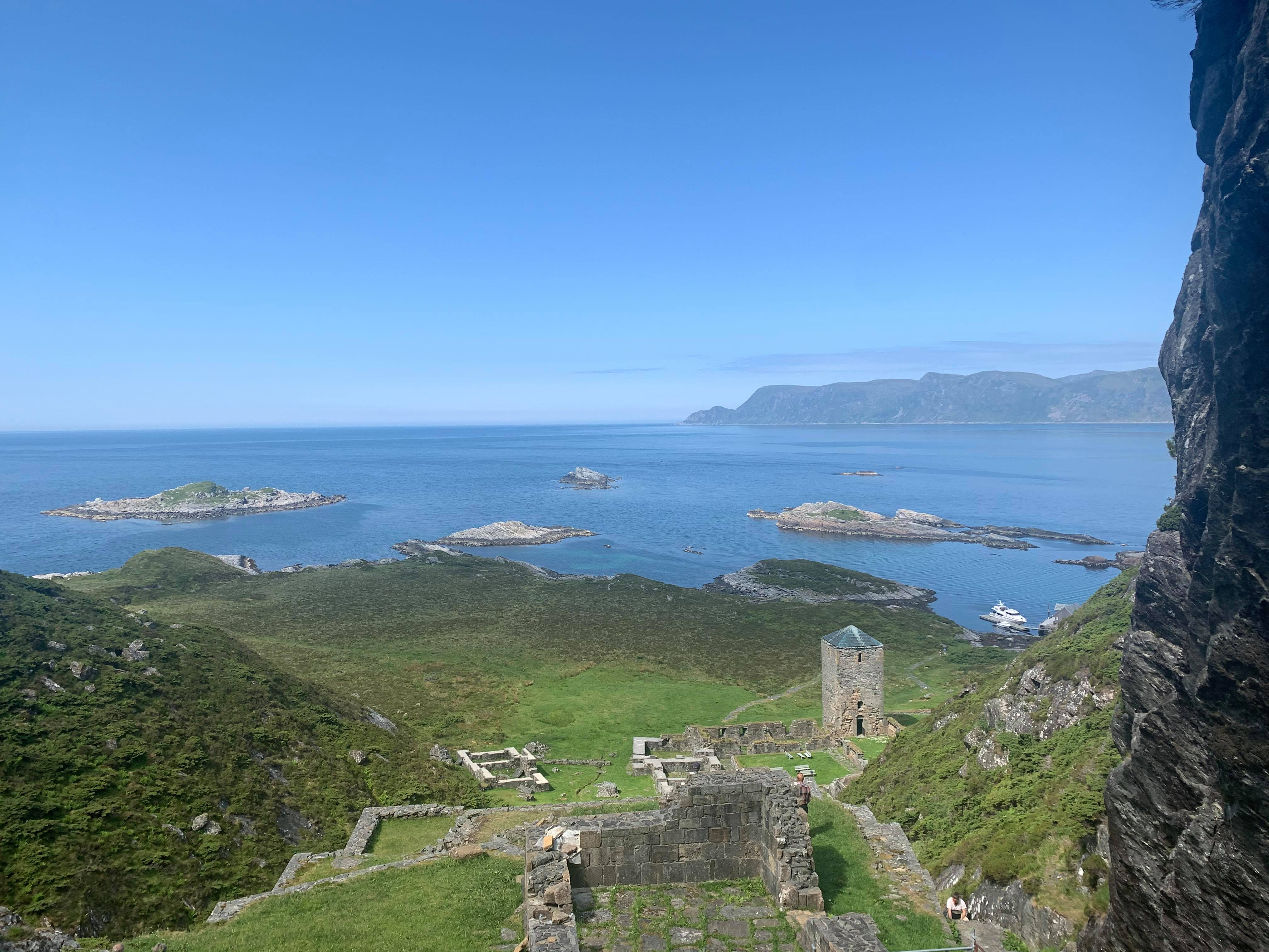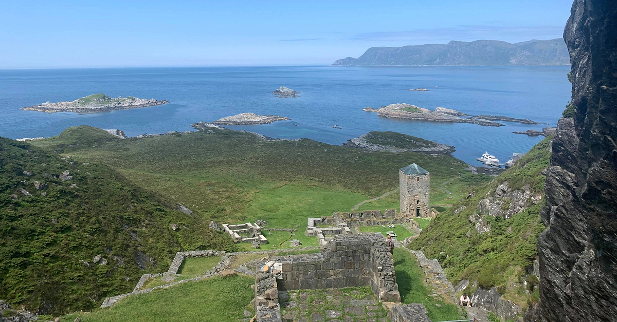 View of the monastery ruins on Selja Island, Stad, Norway from the sacred cave on the island. The Benedictine abbey was constructed in the 11th century CE and was linked to the legend of Saint Sunniva (10th century CE).