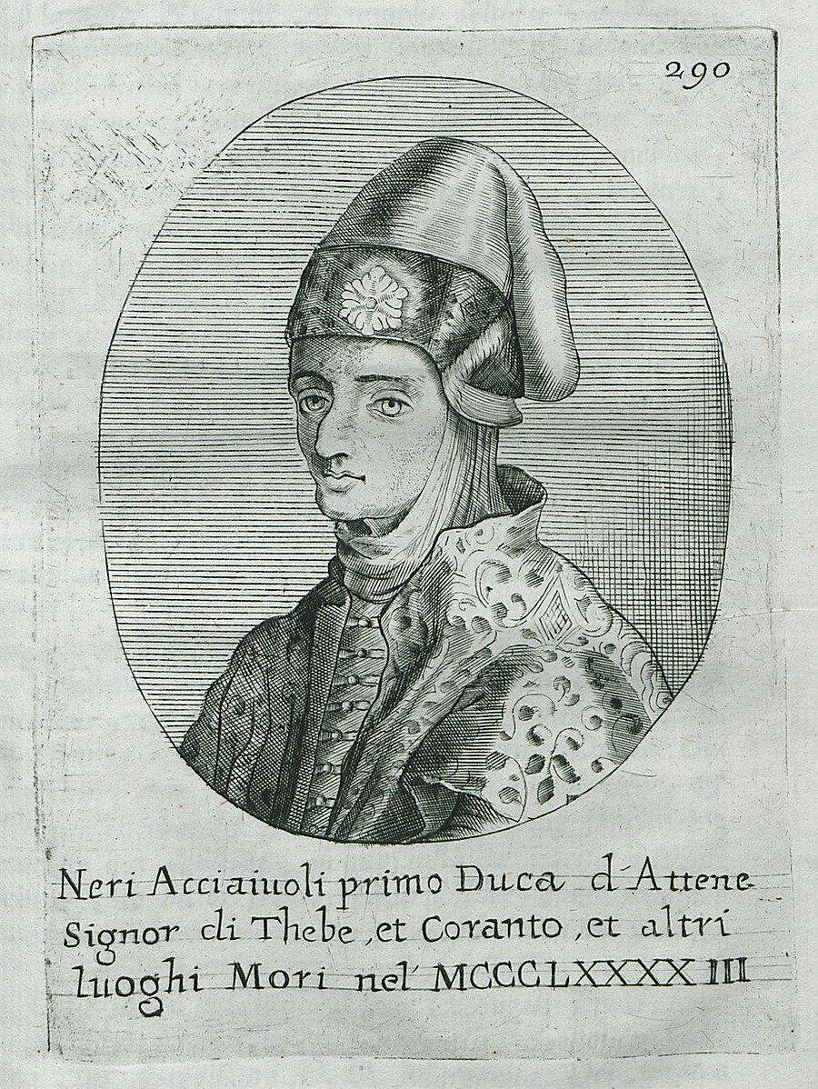 Nerio I Acciaioli, ruler of the Duchy of Athens (r. 1388-1394 CE) who briefly conquered the Duchy of Neopatras. Illustration from Atene Attica Descritta da suoi Principii sino all’acquisto fatto dall’Armi Venete nel 1687…, Venice, Antonio Bortoli, 1695 CE edition, by Francesco Fanelli