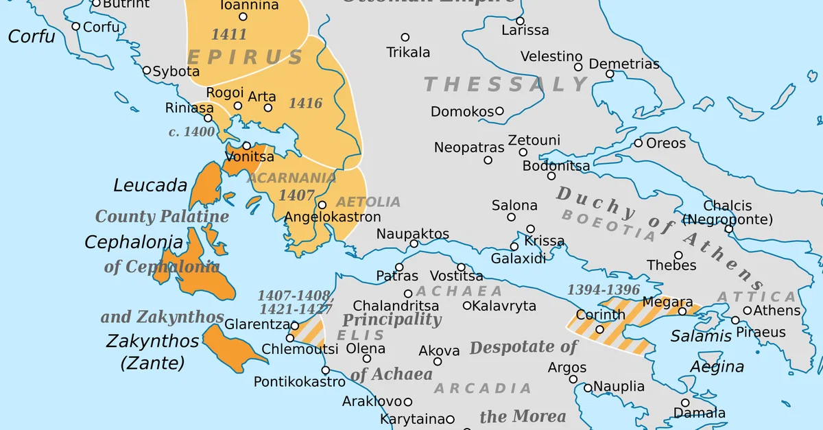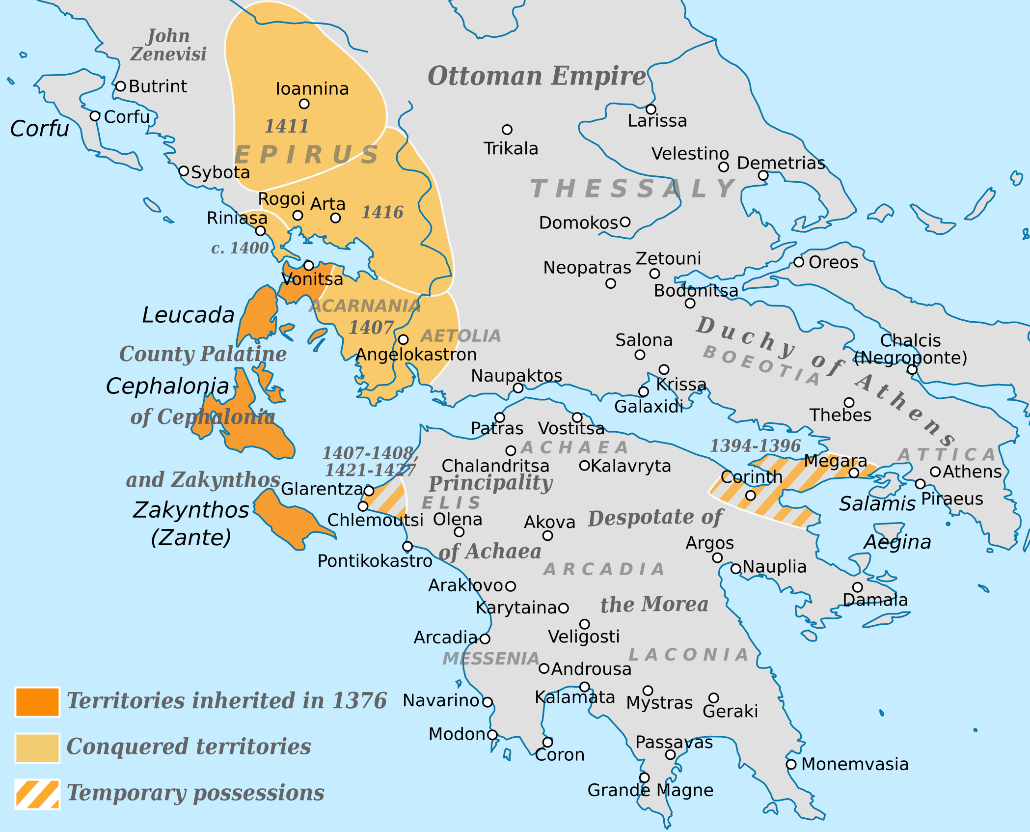 Conquests of Carlo I Tocco, count of Cephalonia (r. 1376-1429 CE) and Despot of Epirus (r. 1411-1429 CE).