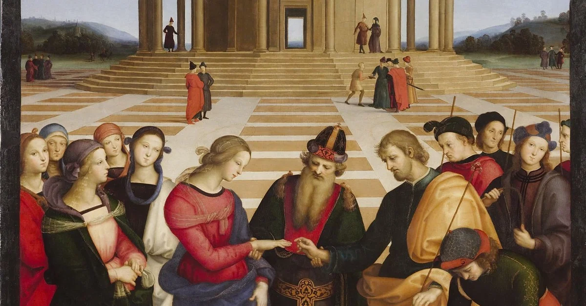 The Marriage of the Virgin painting by the Italian Renaissance artist Raphael (1483-1520 CE). Around 1504 CE. (Pinacoteca di Brera, Milan, Italy)