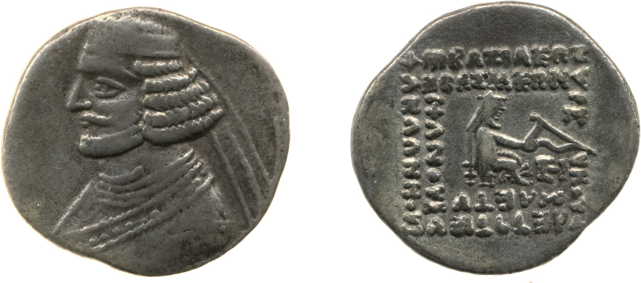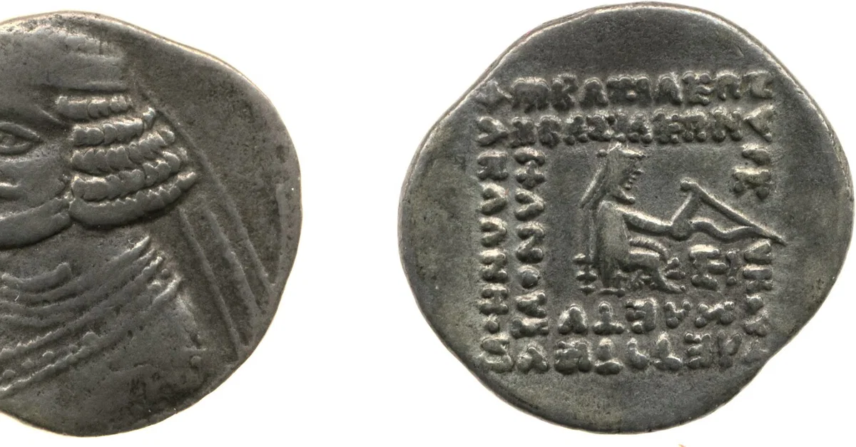 Parthian silver coin of Orodes II (57-38 BCE). The obverse shows Orodes II facing left, wearing diadem and torque, while the reverse depicts an archer seated on a throne.