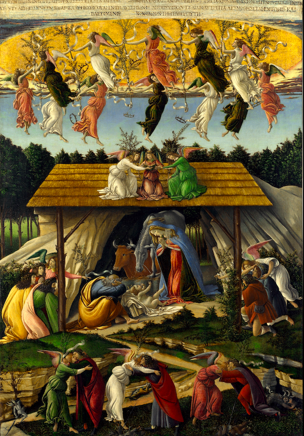 The 'Mystic Nativity' painting by the Italian Renaissance artist Sandro Botticelli (1445-1510 CE). 1500 CE. (National Gallery, London)