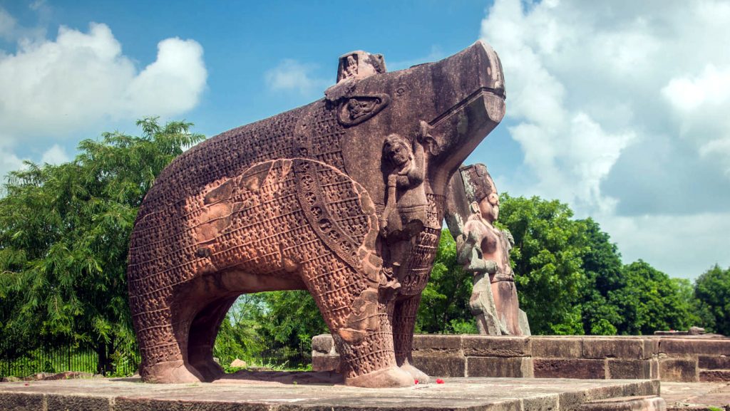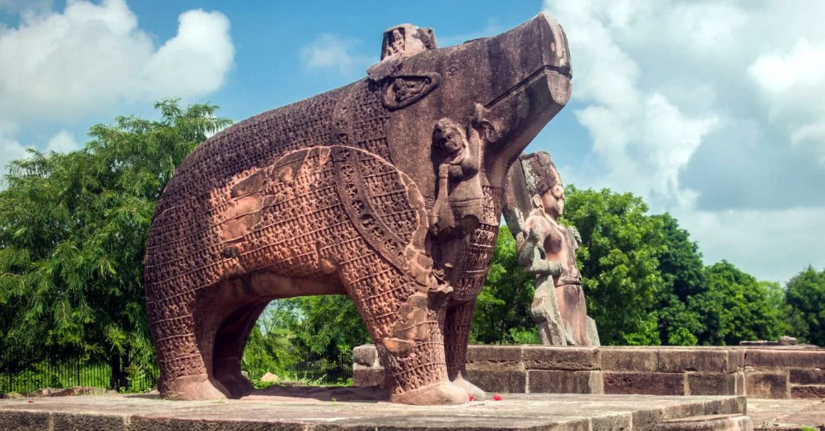 A statue of Lord Varaha, the 3rd boar incarnation of Lord Vishnu. Beside the statue is the Earth goddess Bhudevi. This statue is carved from a single block of red sandstone with a height of 11 feet (3.35 meter). Made c. 510 CE, Gupta Empire. Eran, Sagar, Madhya Pradesh. (Courtesy of District Sagar, Government of Madhya Pradesh)