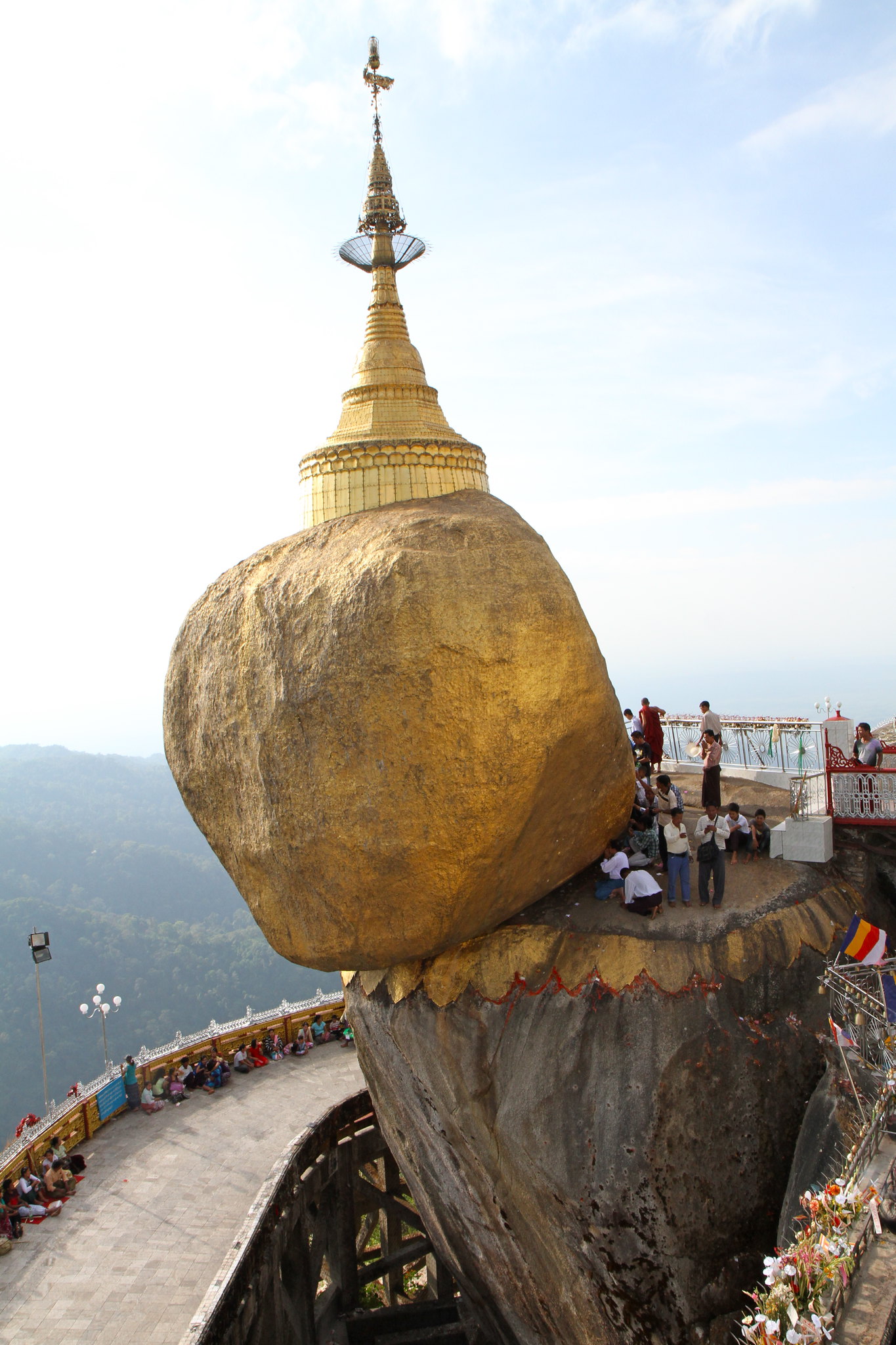 The Kyaiktiyo Pagoda (also known as Golden Rock Stupa) is a 24-foot-high (7.3 m) stupa built on a boulder 25 feet (7 m) high and 50 feet (15 m) in circumference on the edge of a cliff 3, 600 feet (1,100 m) above sea level in the Eastern Yoma Mountains of Myanmar. The stupa was built in 574 BCE, but its origins are obscured by legend.