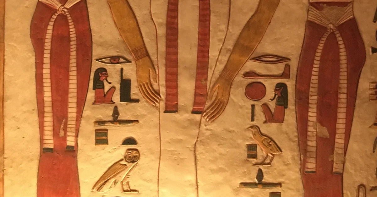 The god Khnum standing between the twin goddesses Isis and Nephthys. From the Tomb of Nefertari in the Valley of the Queens. Thebes, Egypt. 19th Dynasty (1292-1186 BCE).