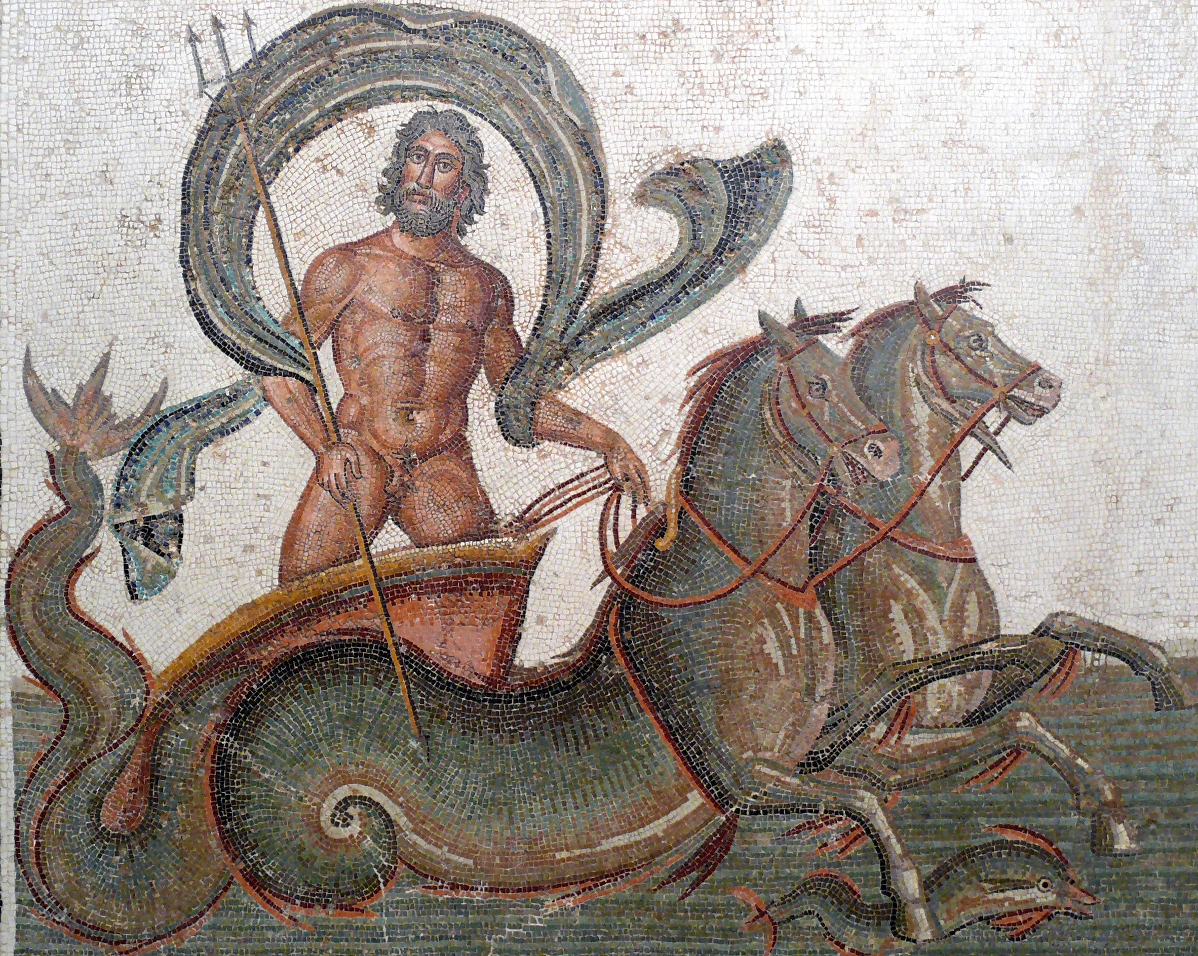 A Roman mosaic depicting the sea god Neptune being pulled in a chariot by two hippocampi. From Sousse, Tunisia. 3rd Century CE. (Sousse Archaeological Museum)